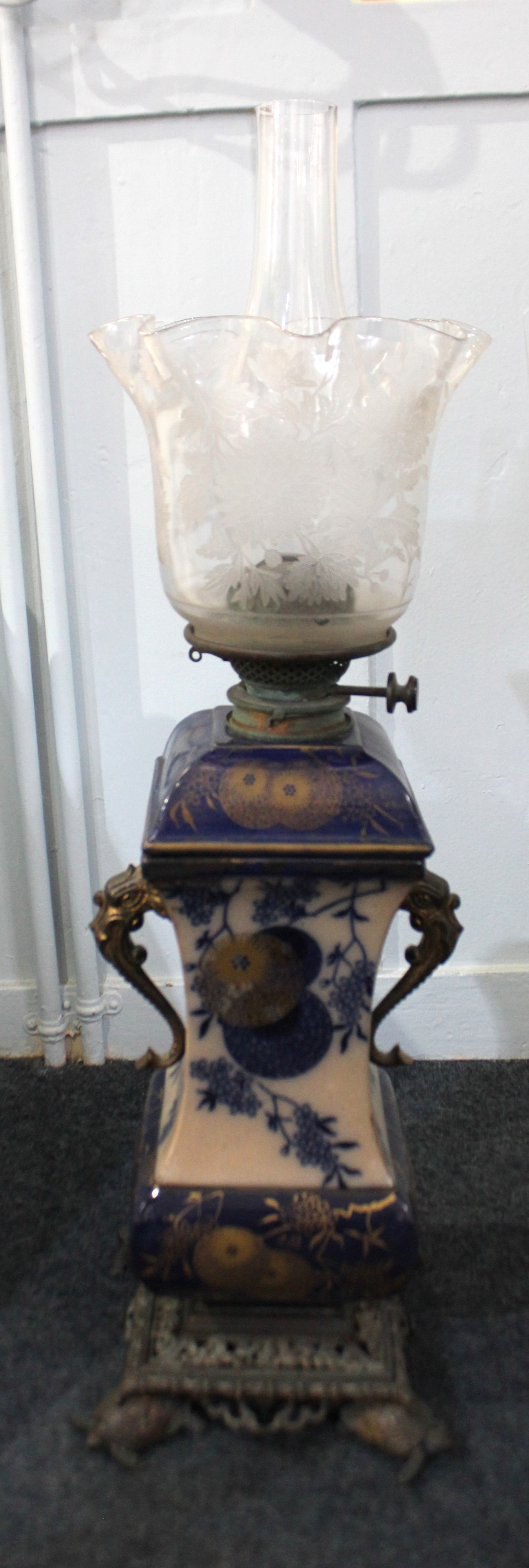 A Victorian oil lamp, the glazed ceramic body of waisted form decorated with fruit, gilt metal mounted with elephant head handles, on tortoise shaped feet, clear glass shade with floral design, 72cm high including funnel