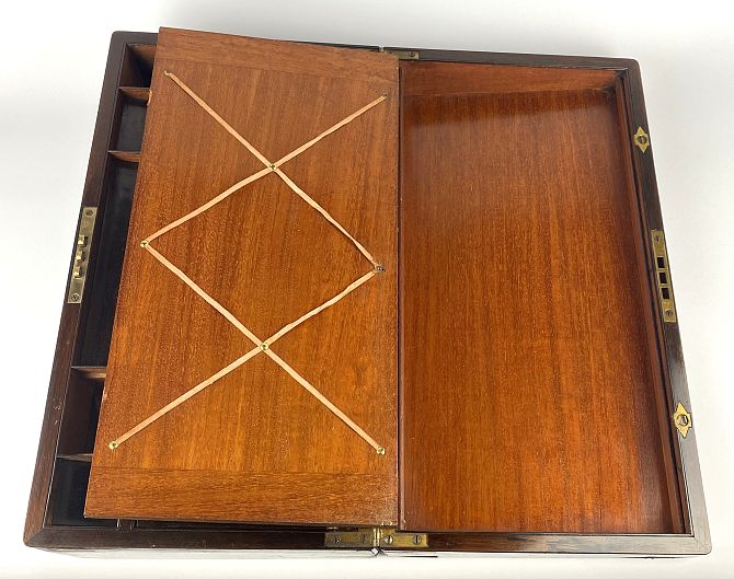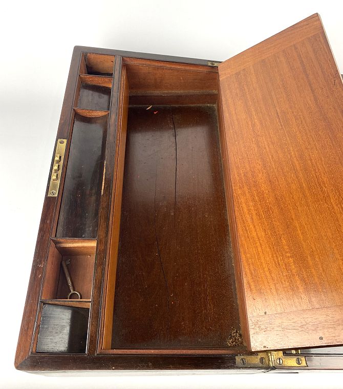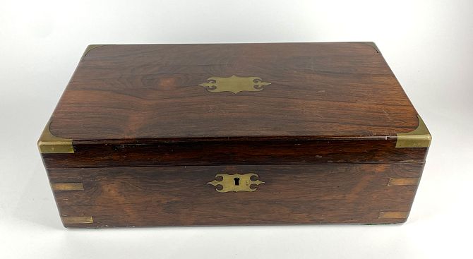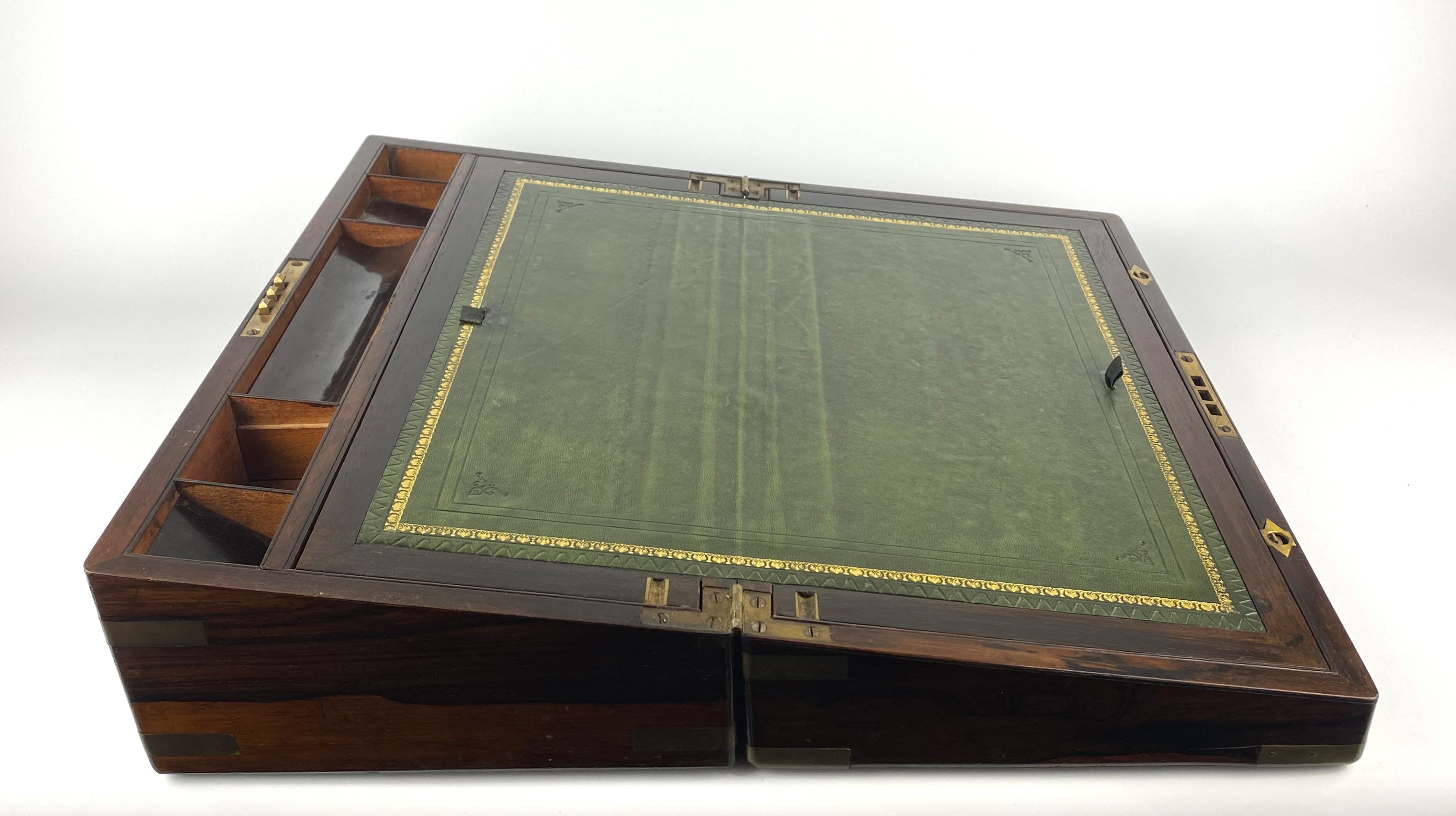 A Victorian rosewood and brass bound writing slope with vacant cartouche, the interior with green leather inset writing surface height 15cm, width 46cm, depth 25cm, with a key