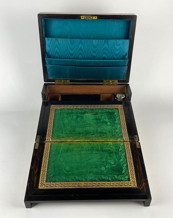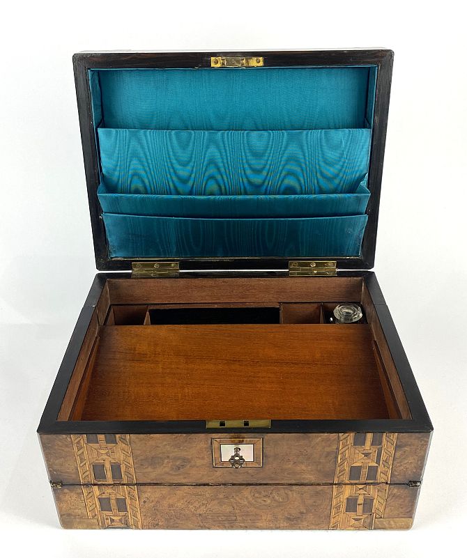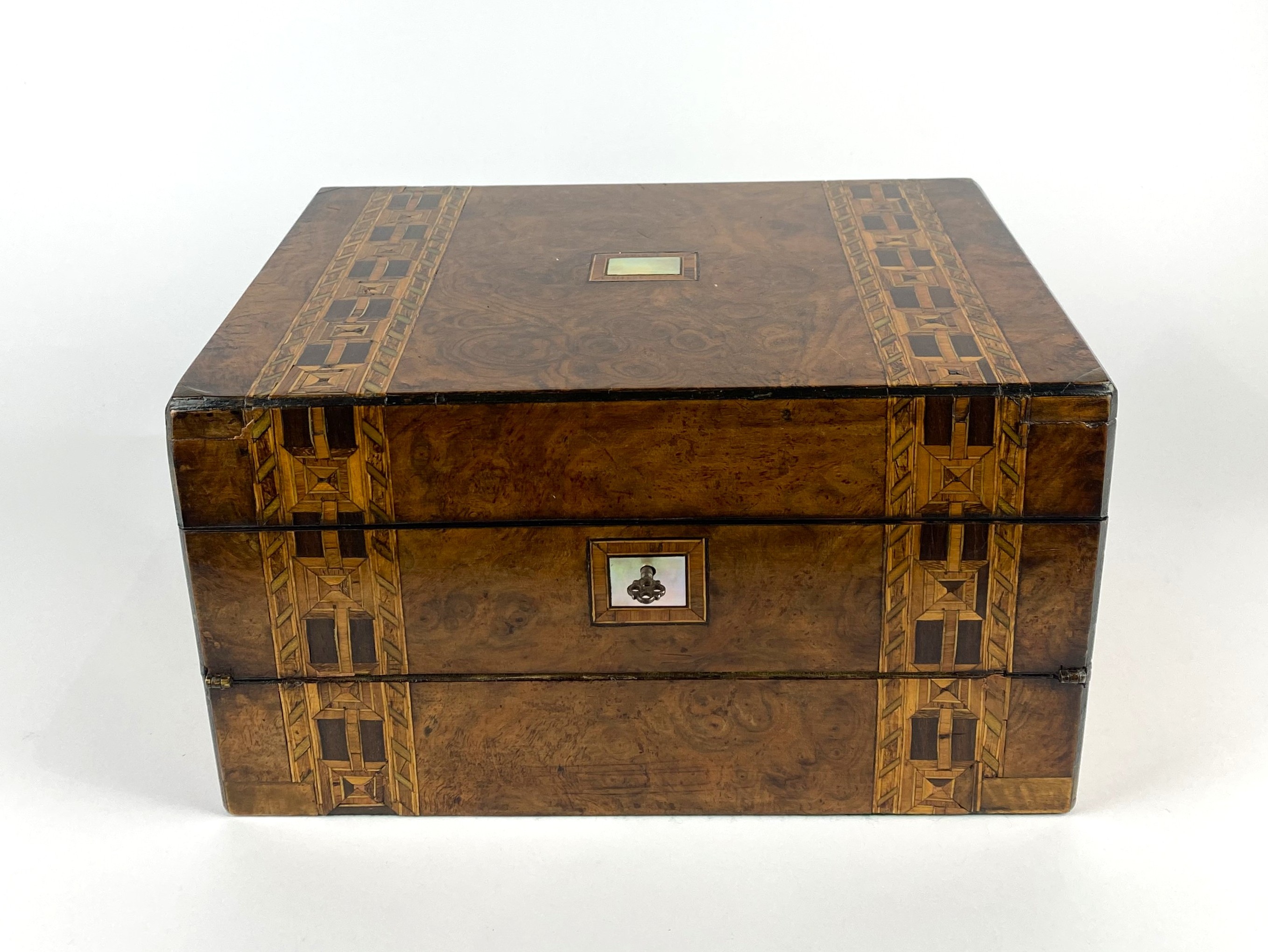 A 19th century burr walnut and Tunbridgeware inlaid writing slope, 17cm high, 30.5cm wide, 22cm deep