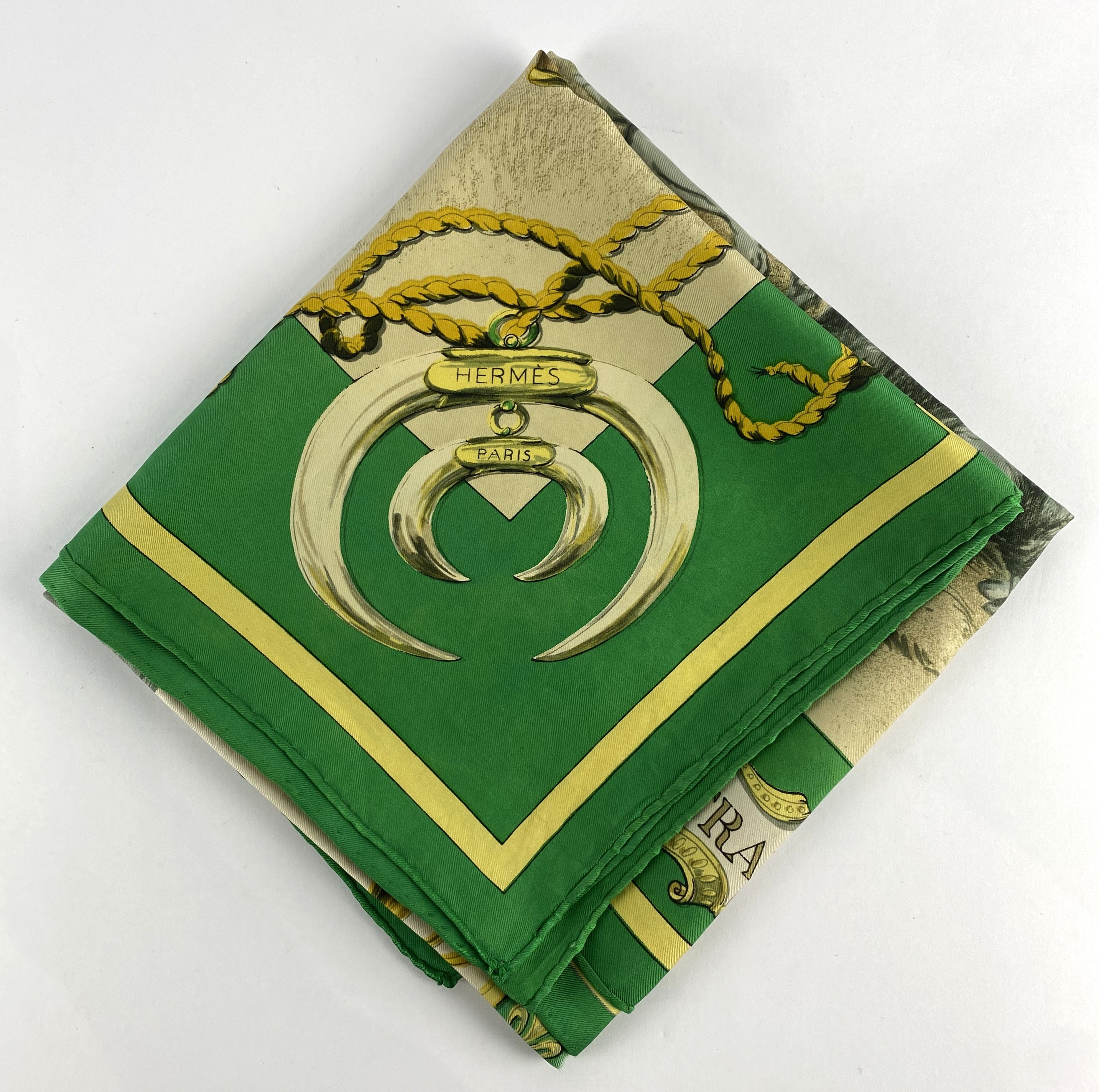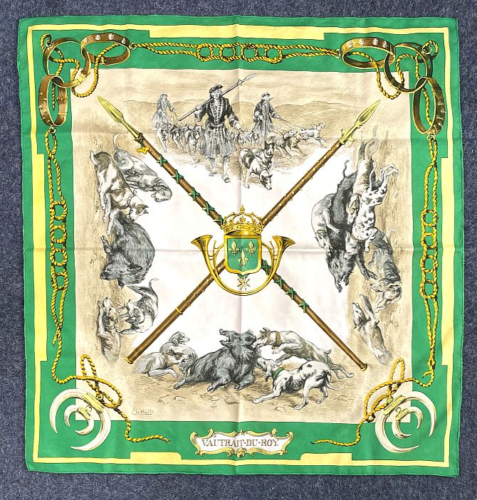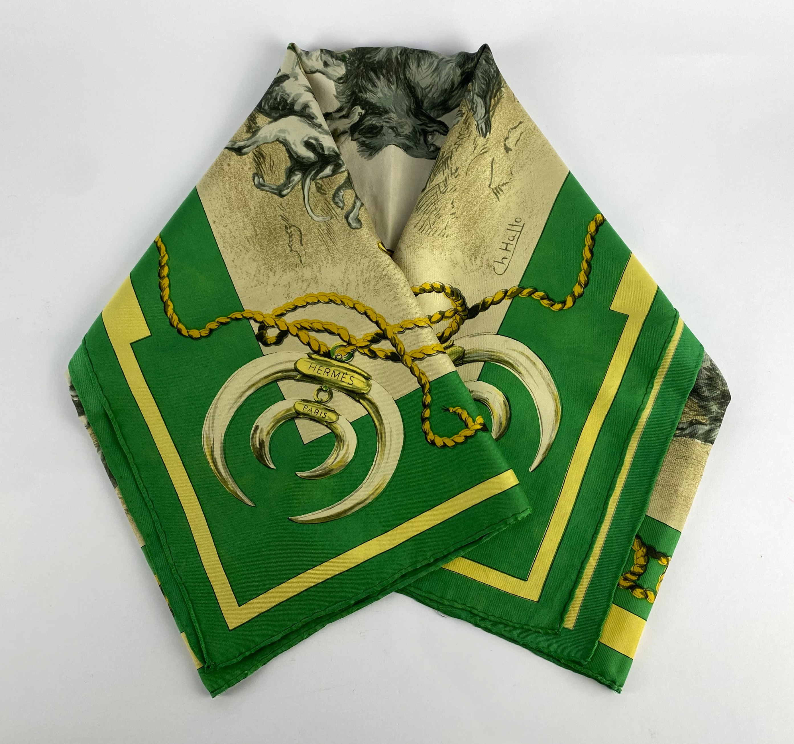 A Hermes 'Vautrait du Roy' green scarf depicting a boar hunt designed by Charles Jean Hallo 1966, 89cm by 86cm (a/f)