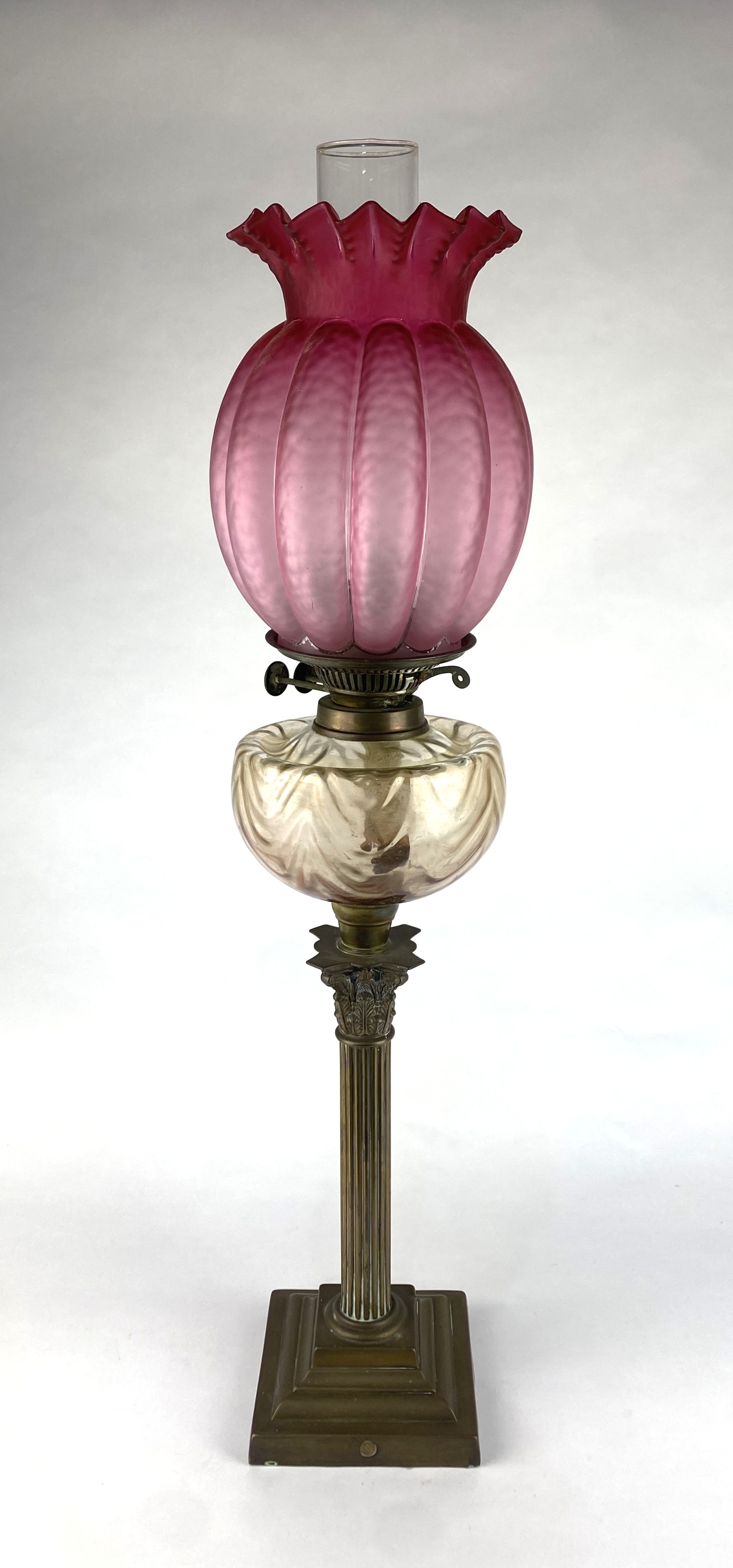 A brass corinthian column oil lamp with swag moulded glass resevoir and cranberry glass shade, late 19th / early 20th century, combined height 70cm.