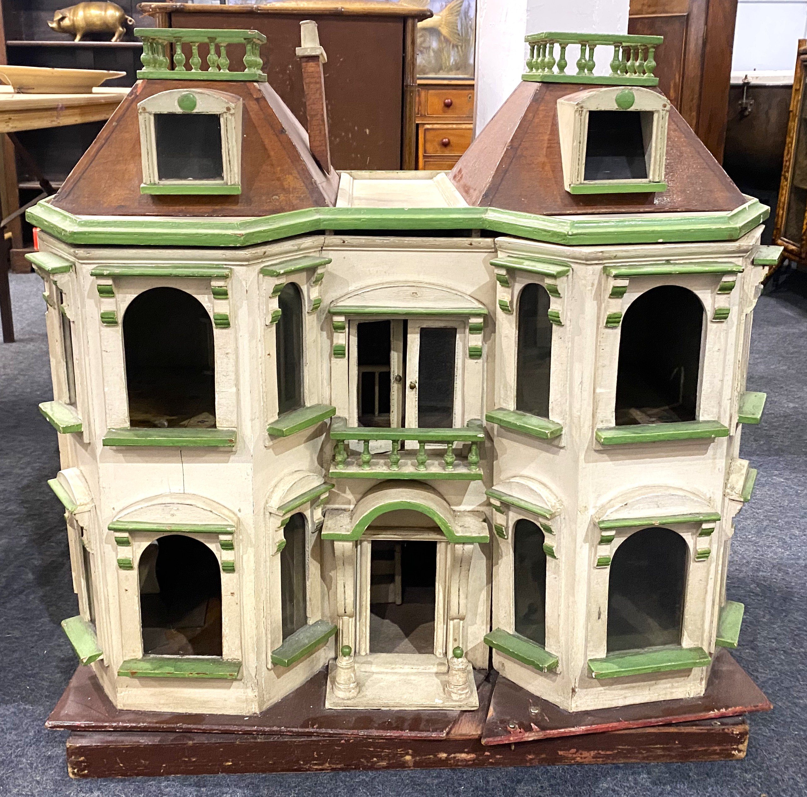 A G. & J. Lines 'Kits Coty' Edwardian dolls house, c.1910, modelled as double fronted villa with bay windows and a balcony above the front door, the mansarded roof with dormers and widow's walks, the four roomed interior with staircase and interior doors, finishes and fireplaces, 84cm wide by 50cm deep by 83cm high, (af), together with a good collection of dolls house furniture and furnishings.