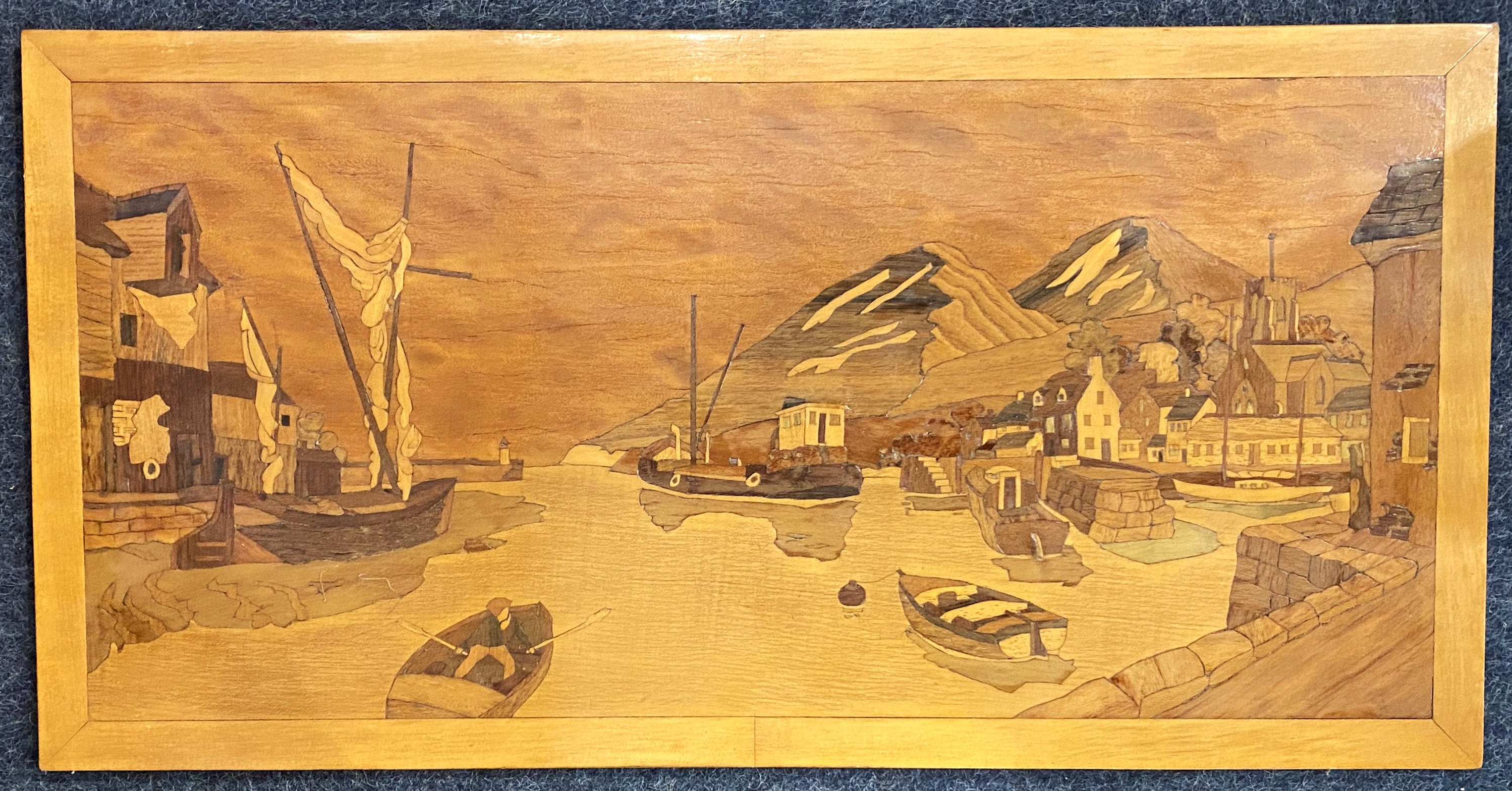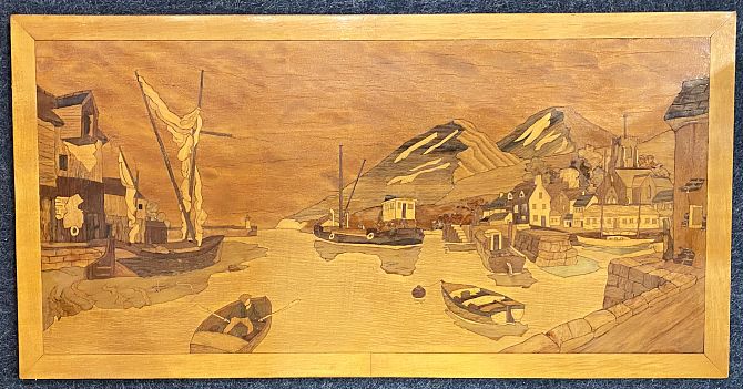 A vintage multi wood marquetry picture panel depicting a harbour scene, 38cm by 76cm.
