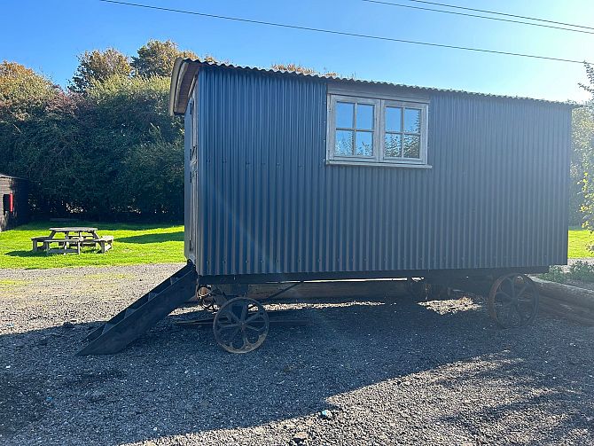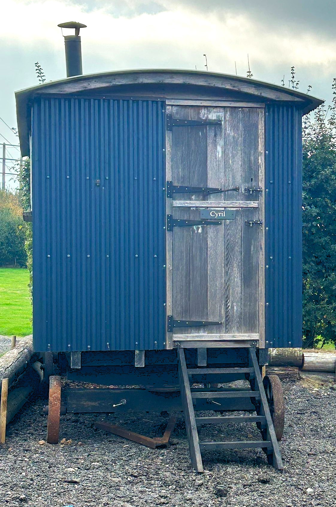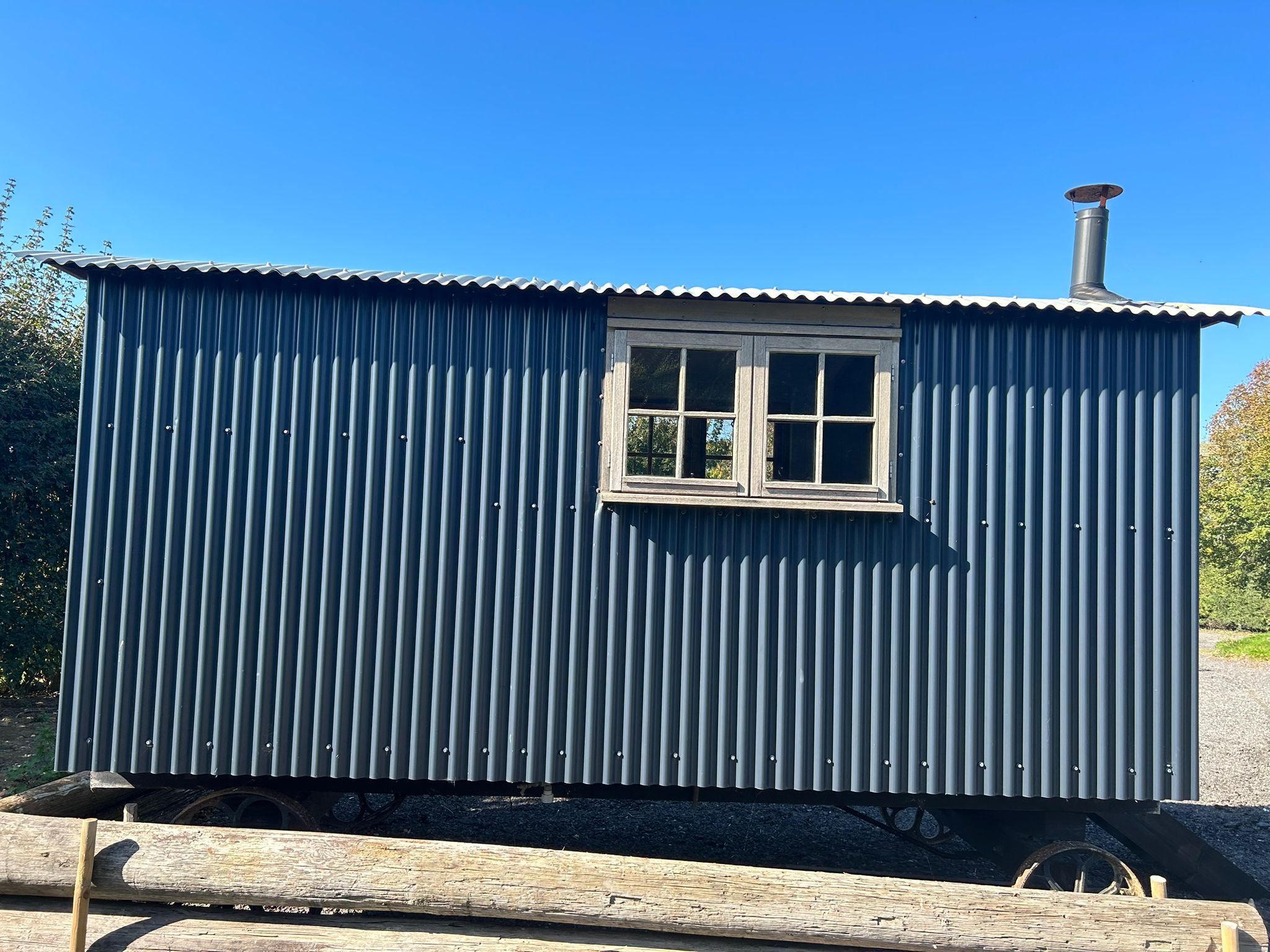 A Shepherds Hut, sympathetically and meticulously refurbished to a high standard, ideal for either commercial accomodation or private use for family and guests, fitted with electrics, plumbing, and a wood burner, size approximately 14.5ft by 7ft.