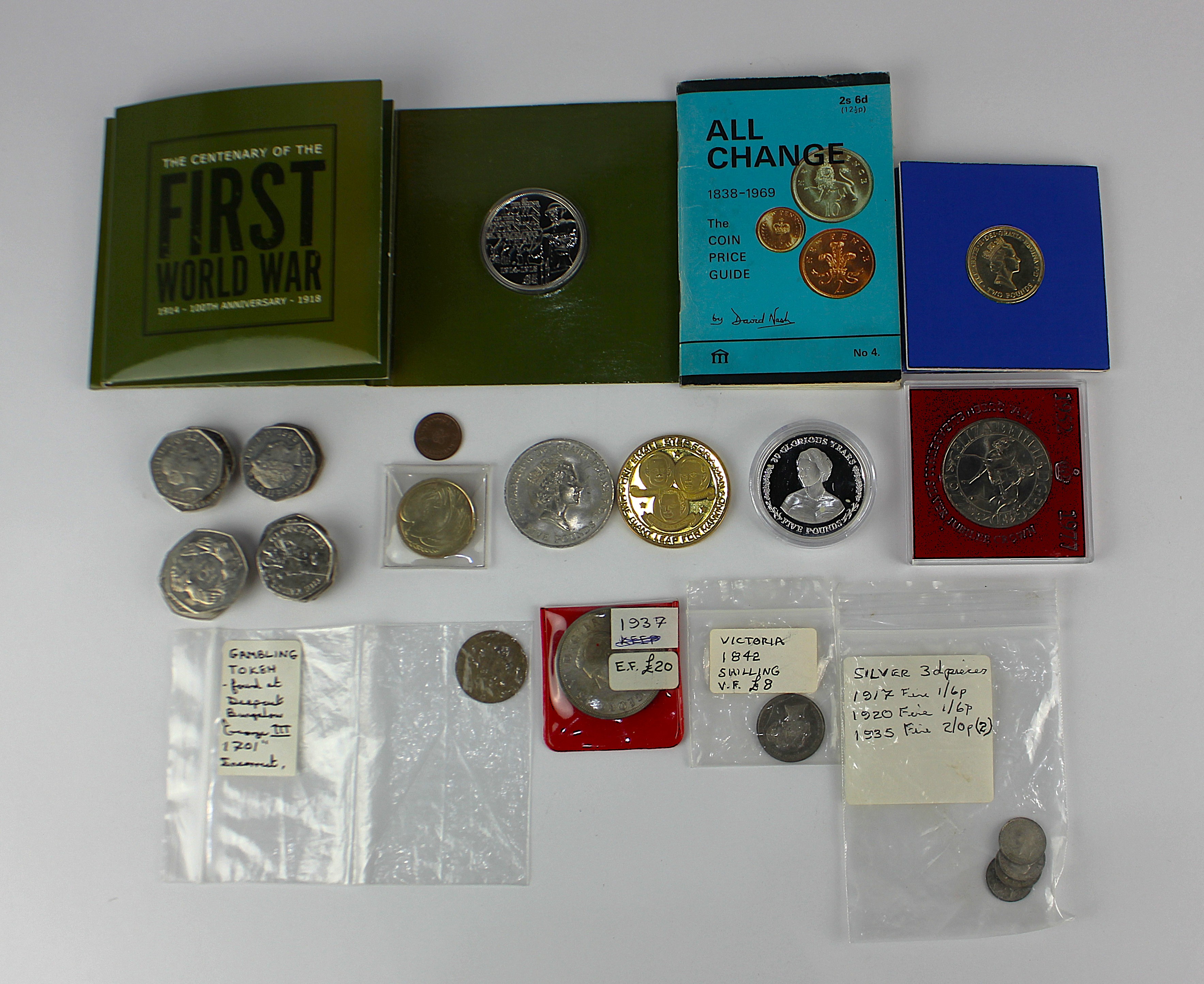 Coins: A collection of British coins, including; two Elizabeth II 2014 First World War centenary £5 coins, sixteen 50 pence coins Beatrix Potter, 1996 Commomemorative £5 coin, McVities £2 coin, Elizabeth II 80th Birthday £5 coin, Charles & Diana 1981 crown, Foot Prints on the Moon medallion, Victorian shilling and others