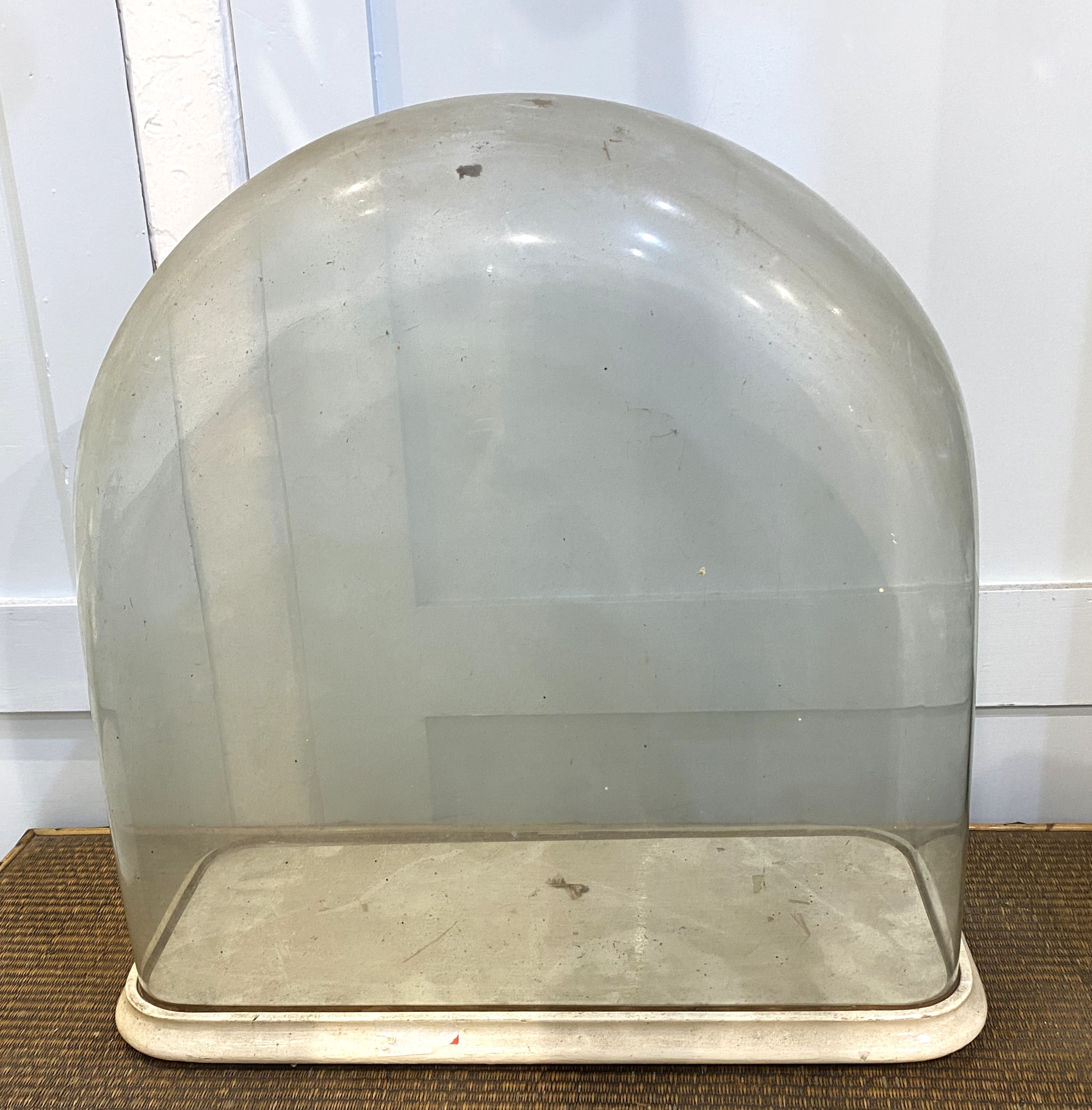 A large Victorian glass dome, on white painted wodden base, 56cm high by 56cm wide.