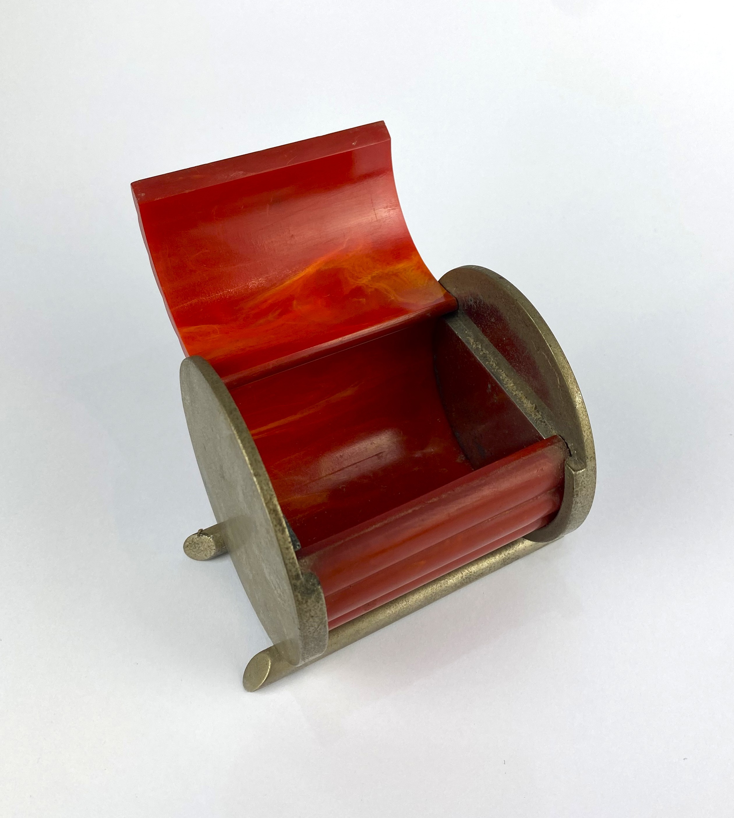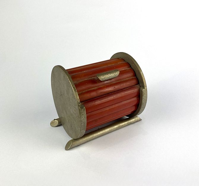 An Art Deco bakelite and silvered metal box, with hinged lid, 9.5cm high.