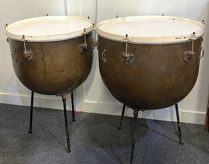 Two vintage English made Premier Everplay kettle drums on stands, 58cm diameter by 83cm high and 52cm diameter by 80cm high.