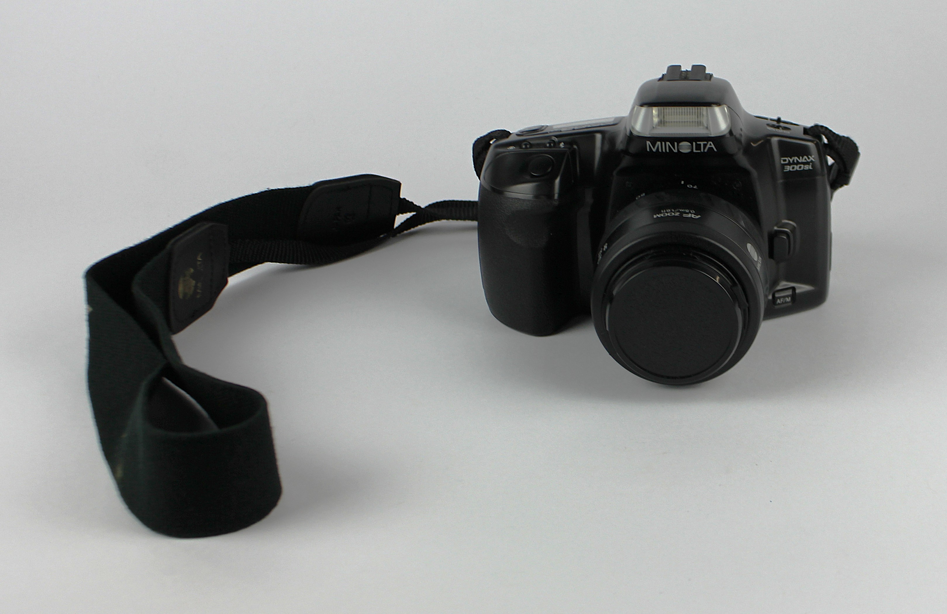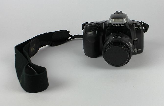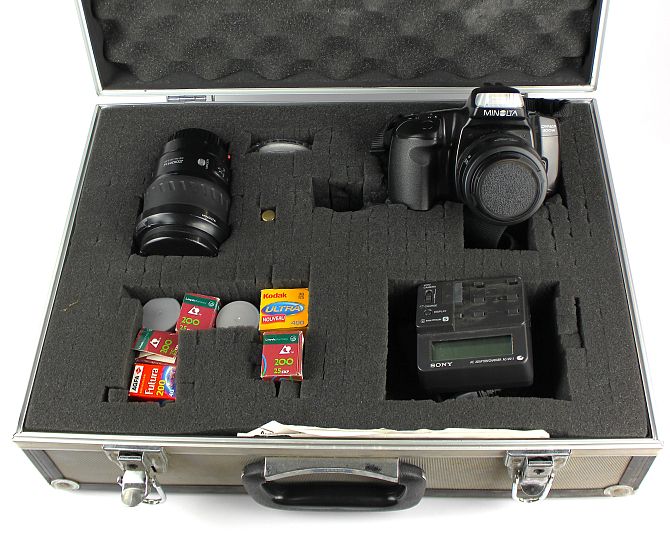 A Minolta Dynax 300si camera with a zoom xi AF 35-200 lens 0.5-1m/1.6-3.3ft, a zoom AF 35-70 0.5m/1.6ft lens, a Sony adapter and various film, in a hard briefcase