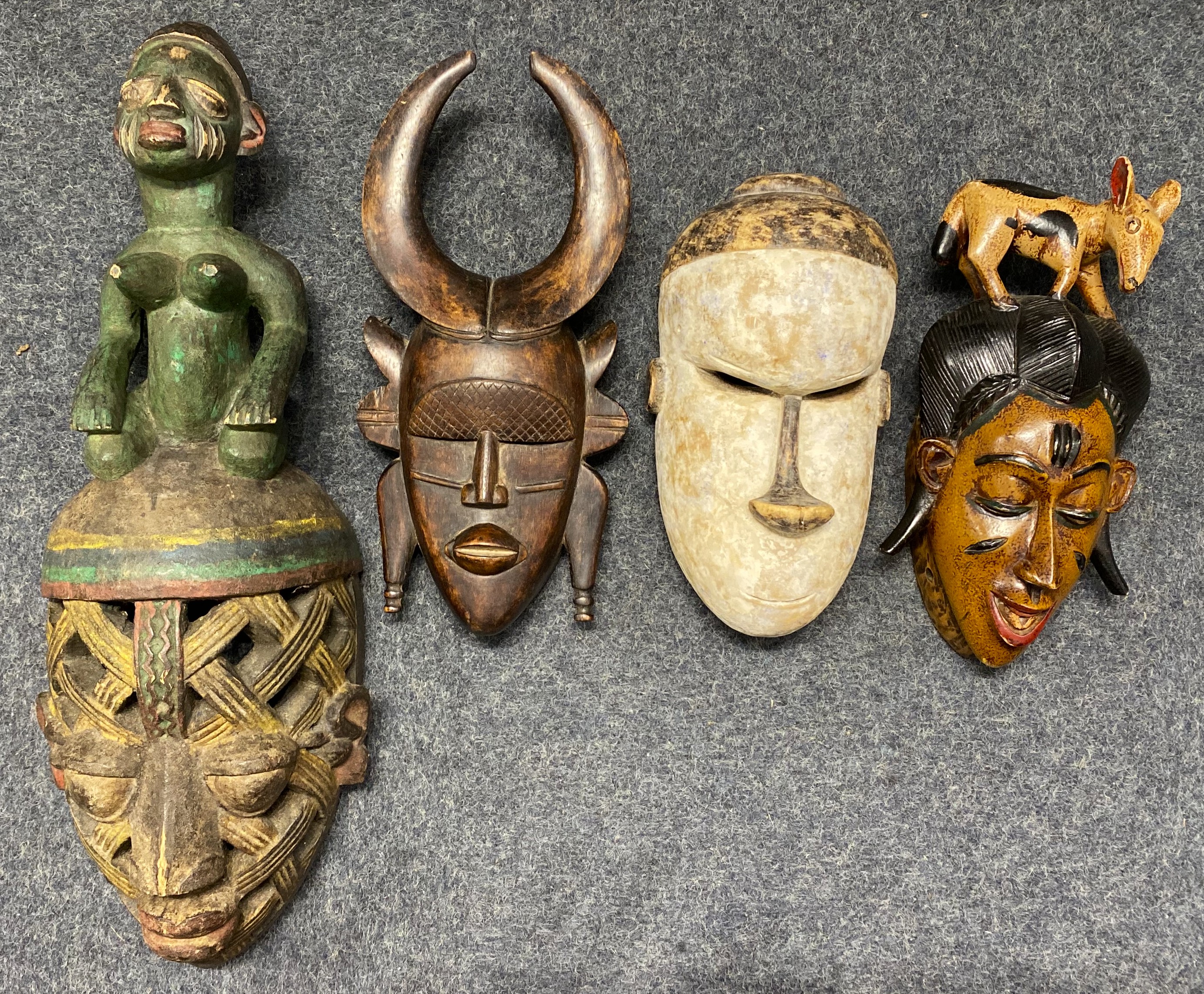 Four decorative African masks comprising a Yoruba style carved wood mask 65cm high, a Yaka mask 30cm high, a Ligbi style mask 40cm and a Guro type mask 35cm