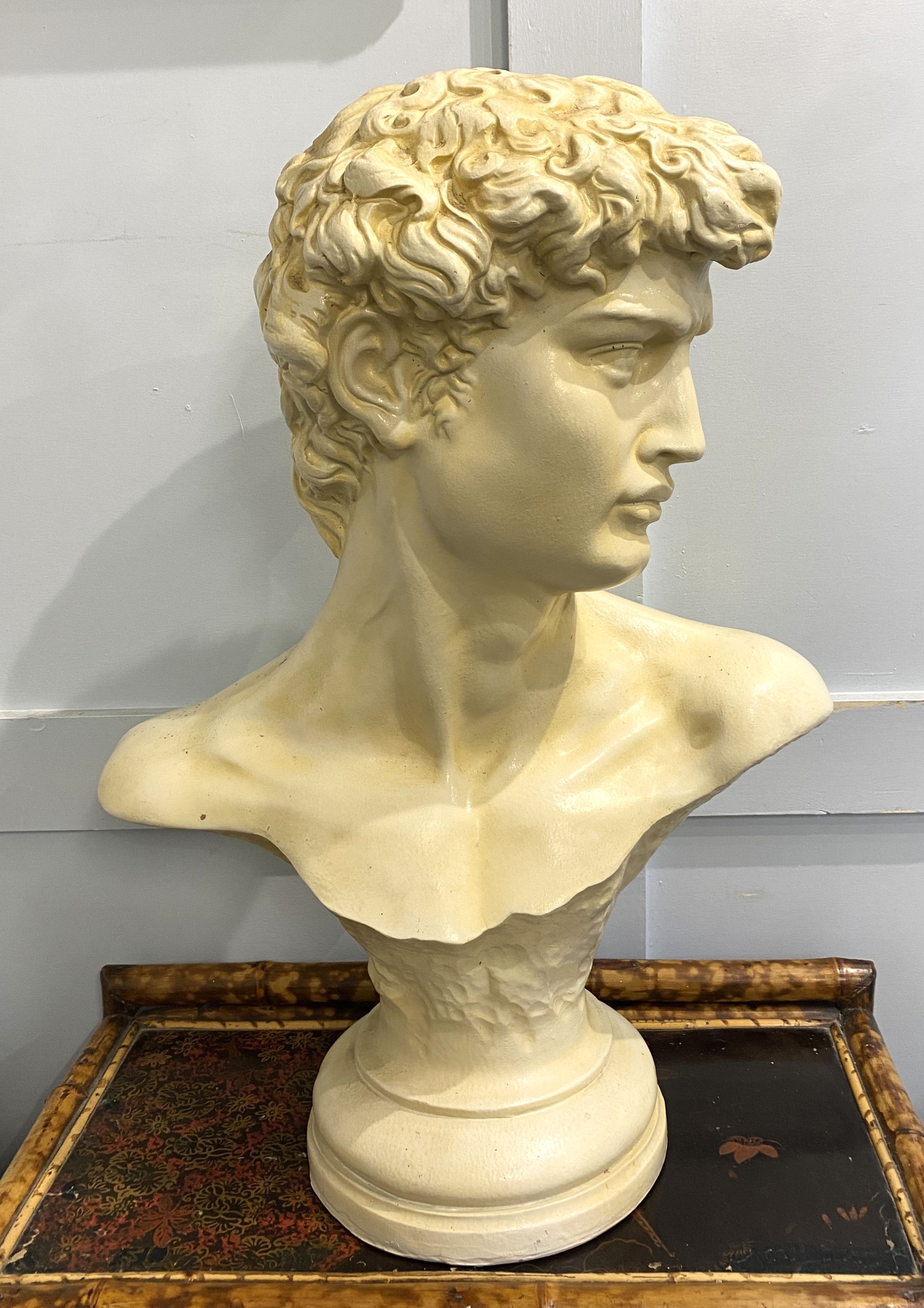 After Michelangelo Buonarroti, a large painted composite bust of David, 69cm high, provenance: from the collection of Southsea Shakespeare Actors, Portsmouth