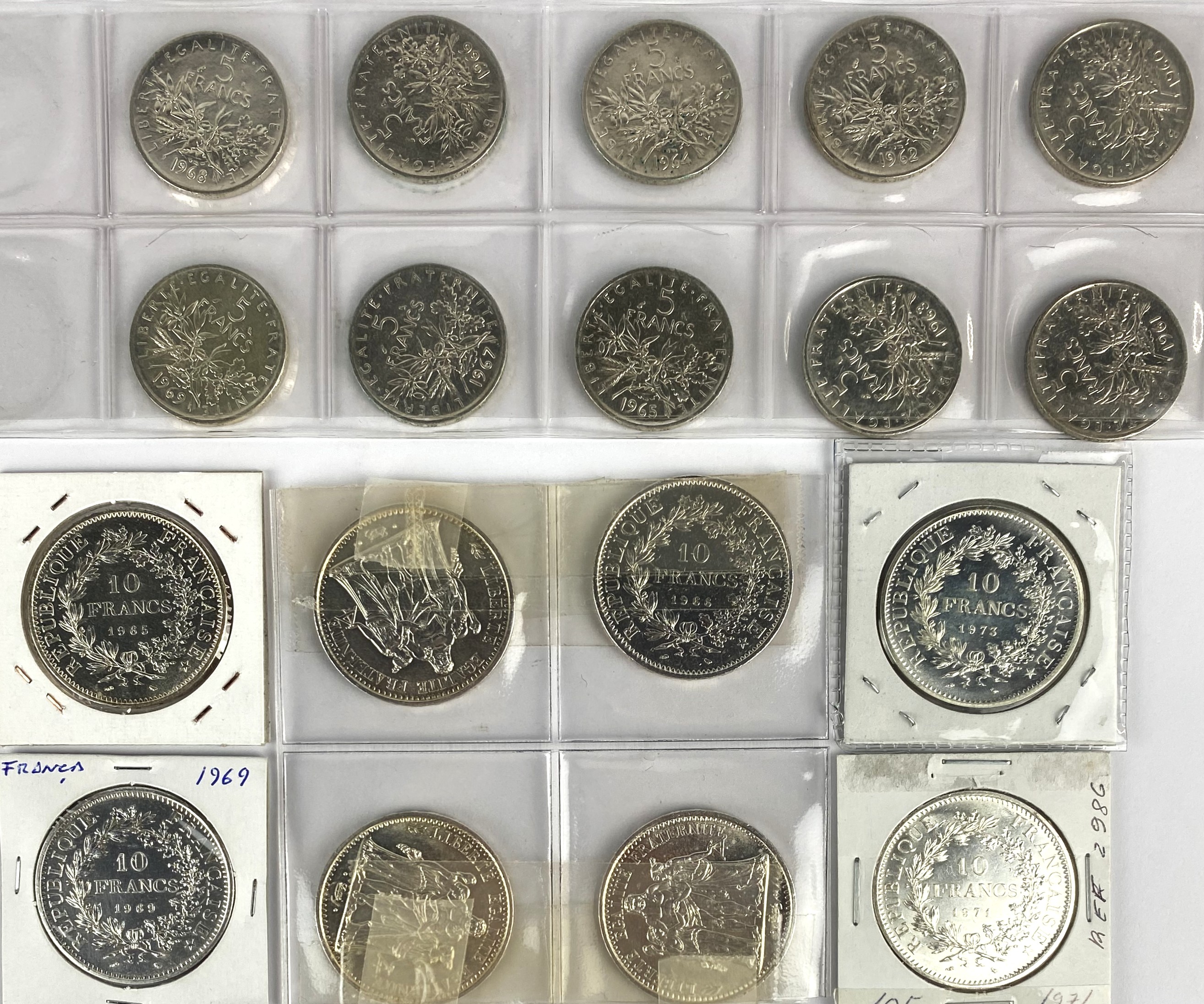 A collection of coins: to include foreign silver examples, eight 1960's French 10 Francs, ten 1960's French 5 francs, etc.