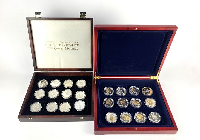 Twenty-four silver proof crown size comemmorative coins mostly relating to the Queen Mother and Elizabeth II with two display boxes, note varying individual weights