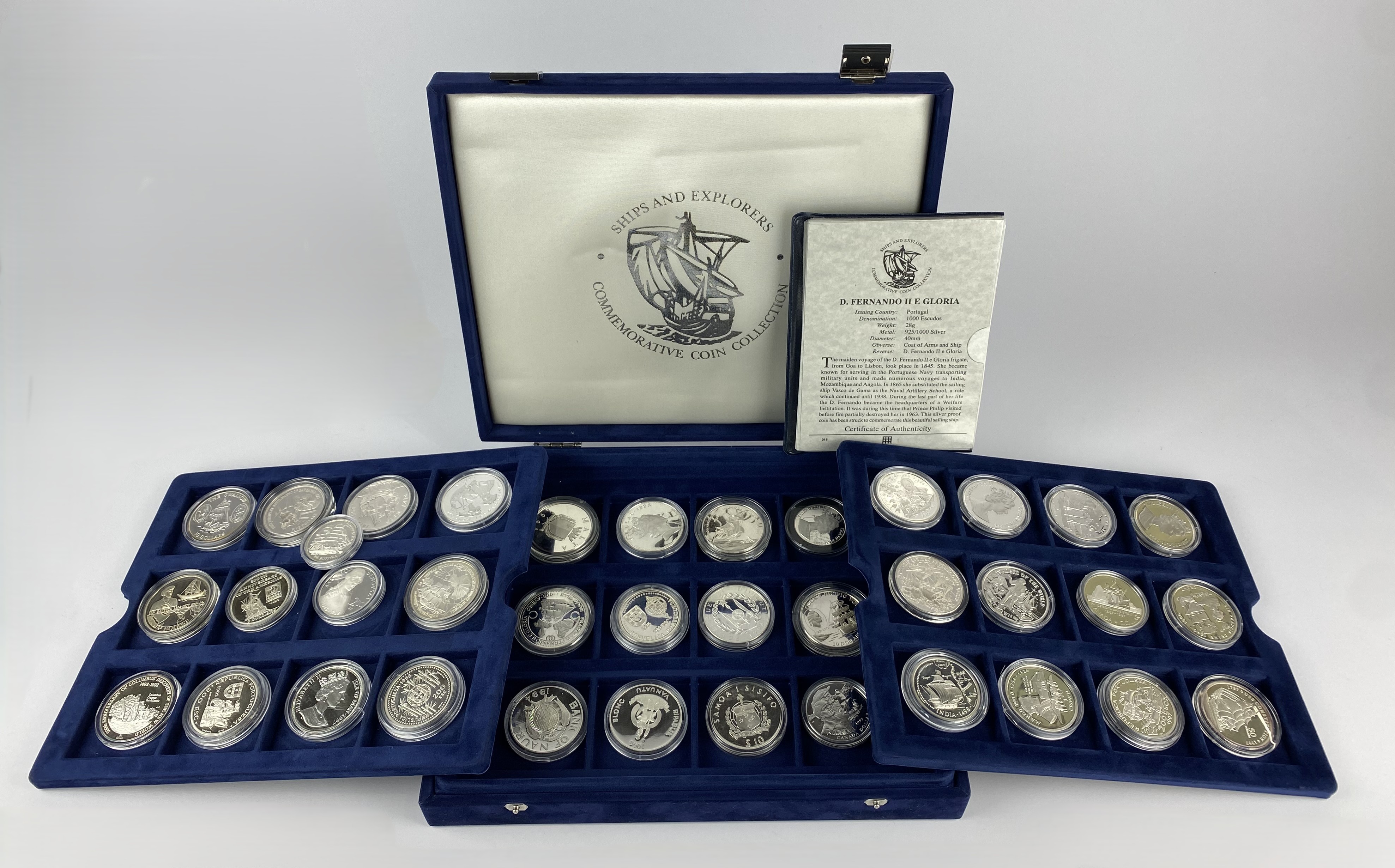 Thirty-seven silver proof comemmorative mostly crown size coins 'Ships As Explorers', with a display box, note variation of weights