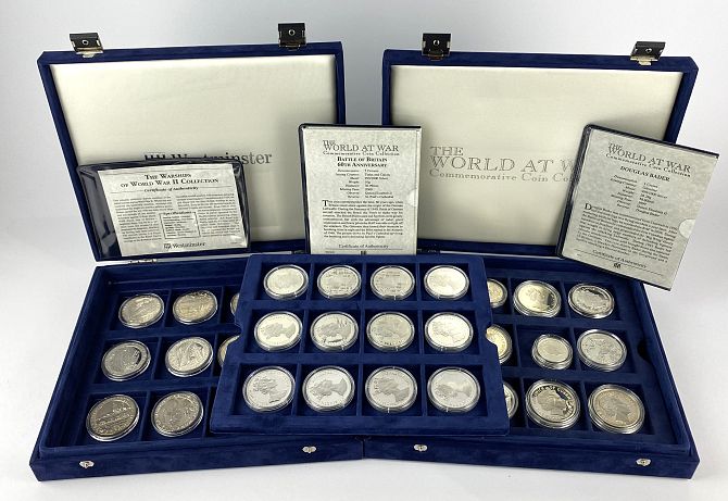 Thirty-five silver and other mostly crown size proof coins including twelve Gibraltar and two Guernsey, Note: variation of weights, also twelve Warships of World War Two comemmorative crowns, with two cases