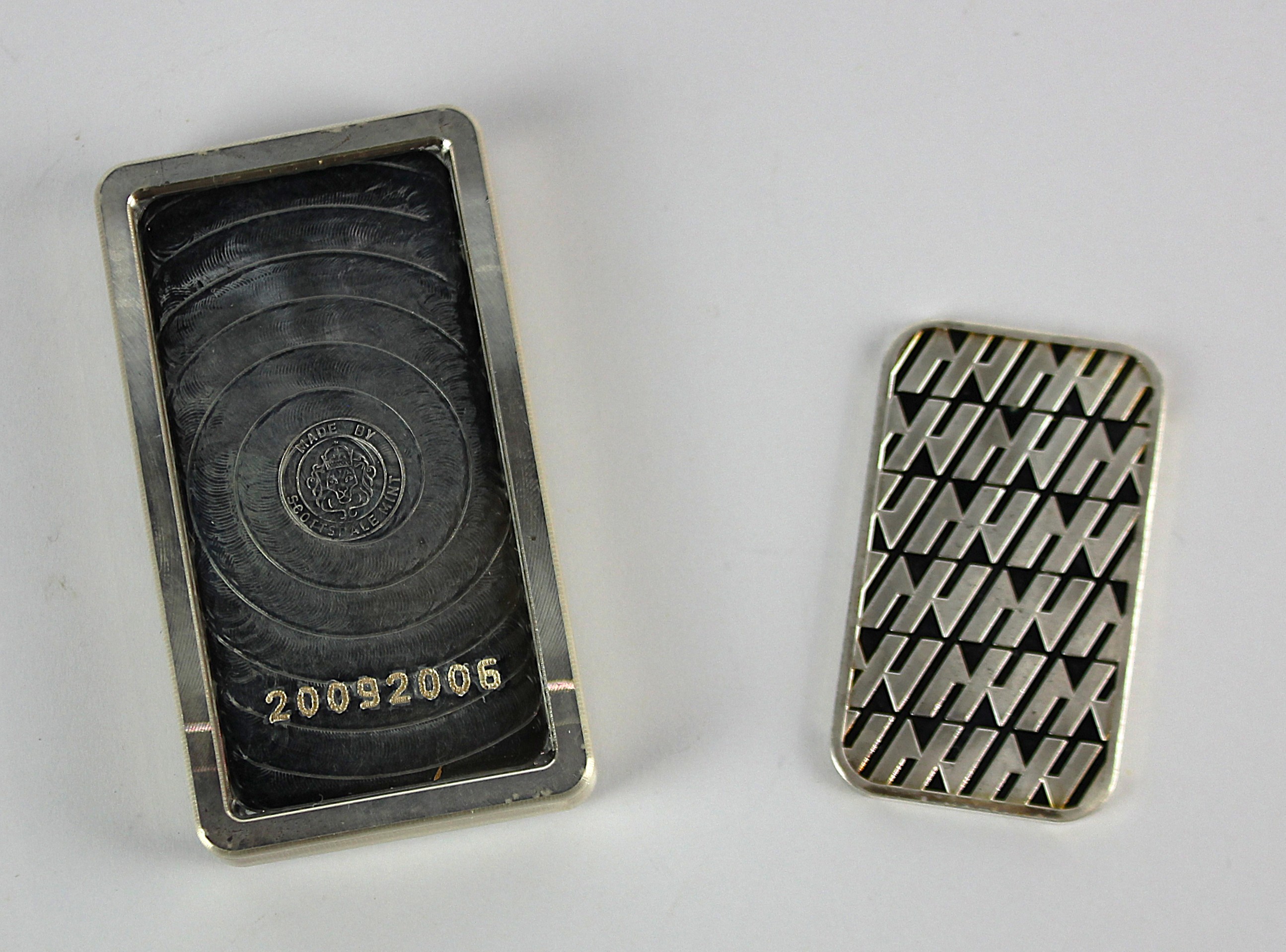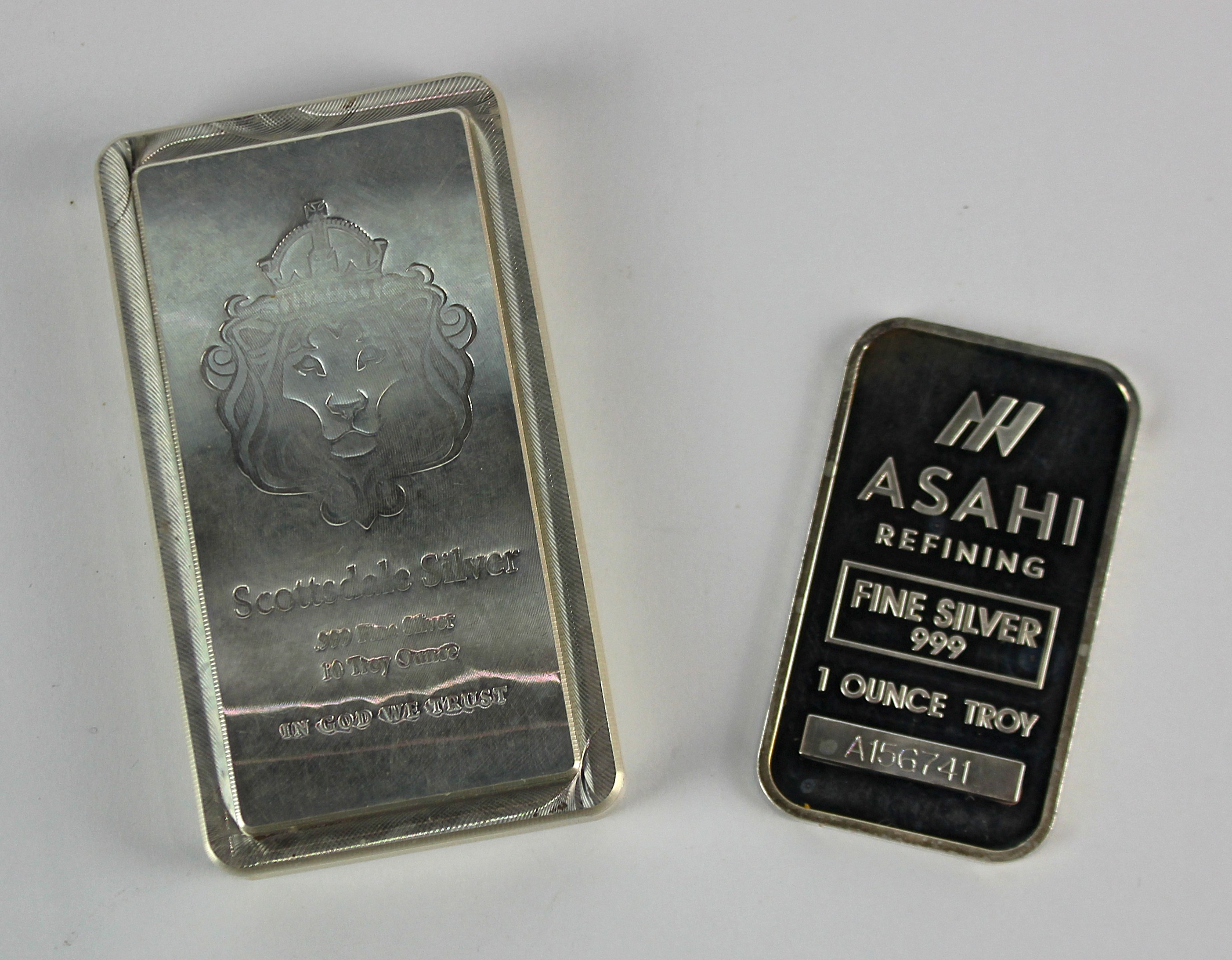 A Scottsdale Mint .999 fine silver ingot detailed 10 Troy Ounce weight 313g, and an Asahi Fine Silver .999 1 Ounce Troy ingot weight 31g