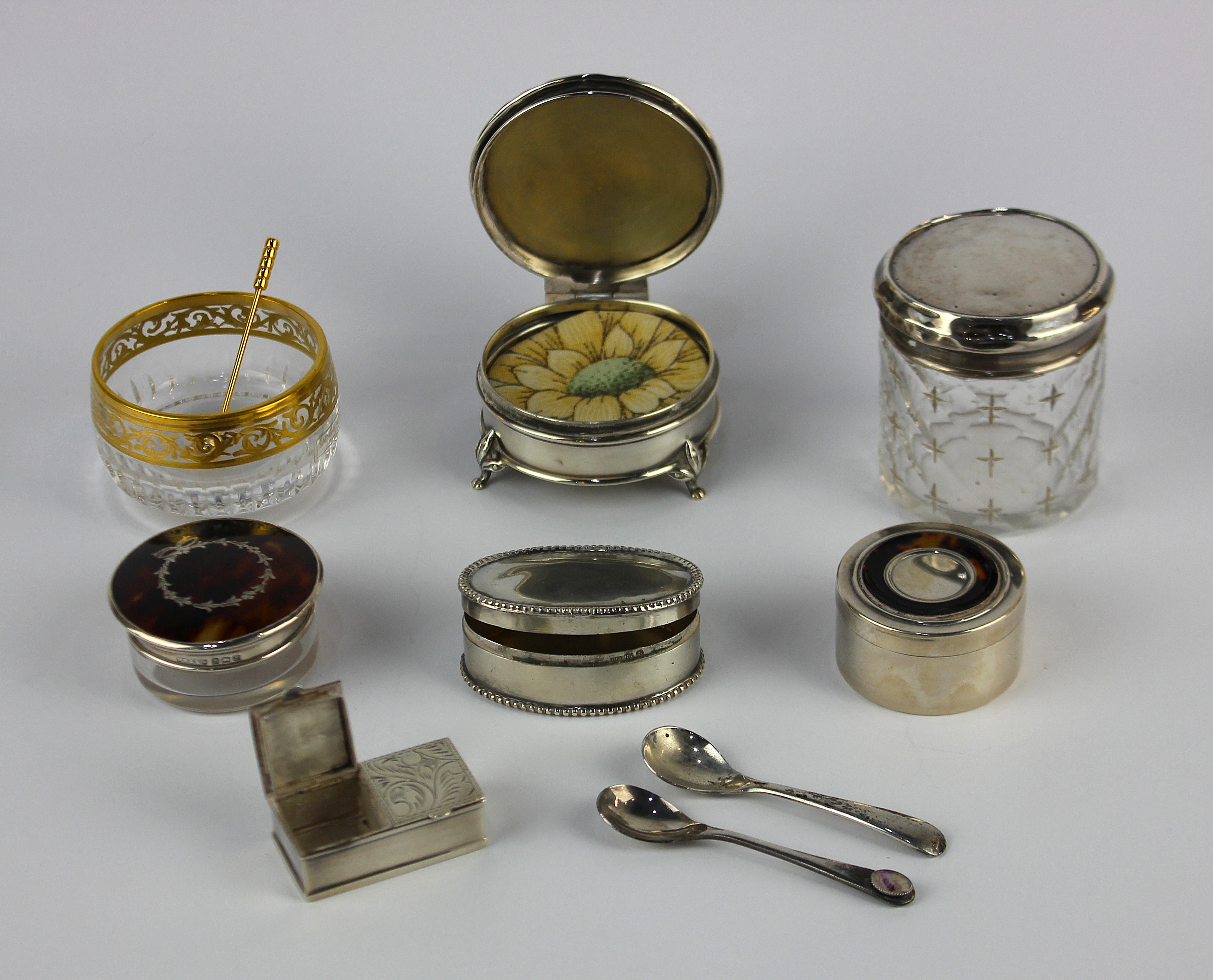 A silver double compartment stamp box, London, 1989, with engraved foliate decoration to dual lids, bearing 925 marks, width 4cm, together with a round silver trinket box, raised on three feet, Brimingham, 1917, a white metal trinket box with beaded border marked 800, a round silver trinket box, by Harman Brothers, Birmingham, 1994, a George V silver topped cut glass dressing table pot, Birmingham, 1915 (AF), a silver condiment spoon, a silver plated condiment spoon, a silver and tortoiseshell topped glass trinket pot, lid inset with garland motif, by William Griffiths & Sons, Birmingham, 1923, and a gilt metal and glass St Louis, France salt with spoon set (10)