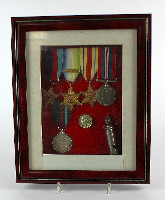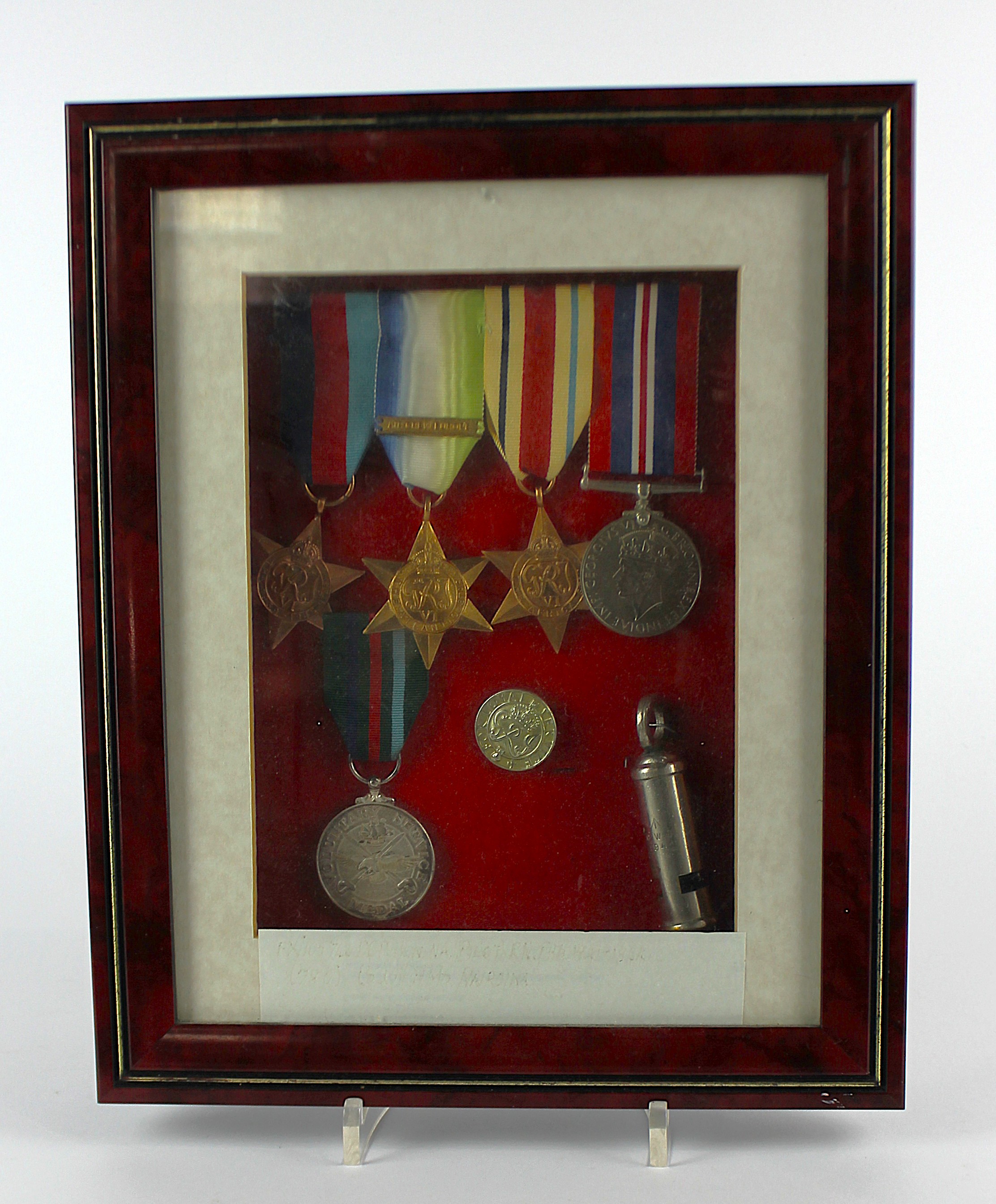 The later issue Second World War medals relating to DE Pullen FX105746 RN issued in 1993 comprising the 1939-45 Star, the Atlantic Star with bar Air Crew Europe, the Africa star, the 1939-45 War medal, the Voluntary Service medal, the Loyal Service Badge and a whistle detailed CWS 1941 framed with some paperwork