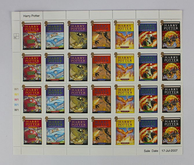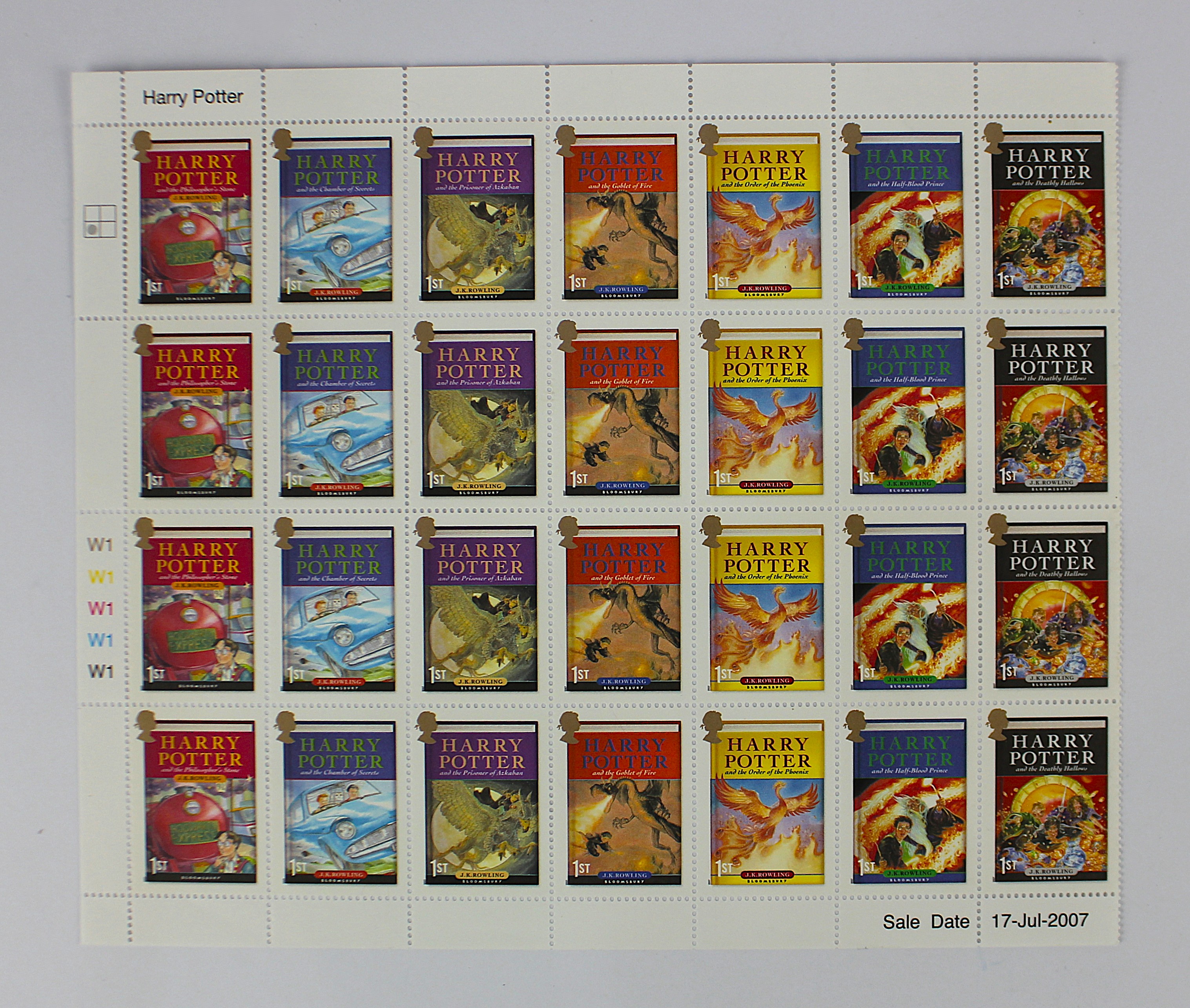 Stamps: A single sheet of twenty-eight Harry Potter book cover 1st class stamps, dated 17-Jul-2007, released to commemorate the release of Harry Potter and the Deathly Hallows