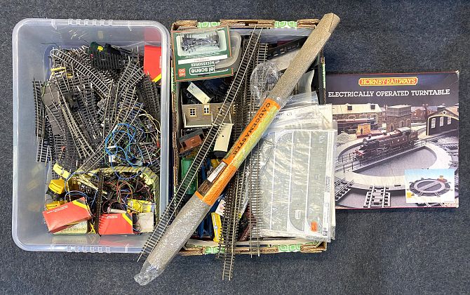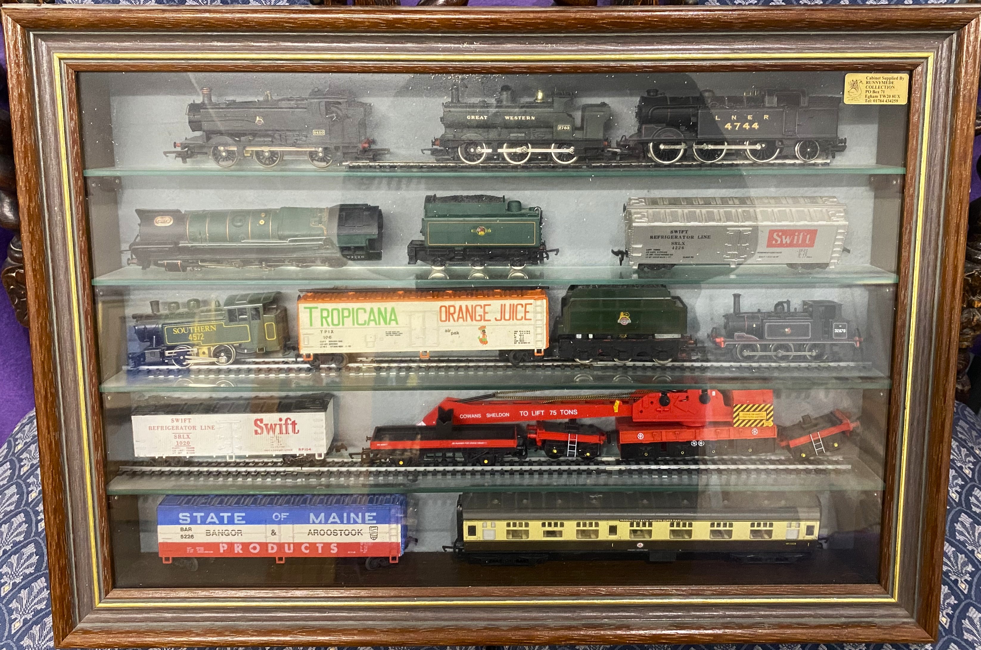 Model Railway: a collection of 00 gauge model railway, some Hornby, to include a glazed case containing locomotives, coaches and rolling stock etc, various buildings (a/f), track, and a quantity of empty Tri-ang, Lima and other model railway boxes (a/f)