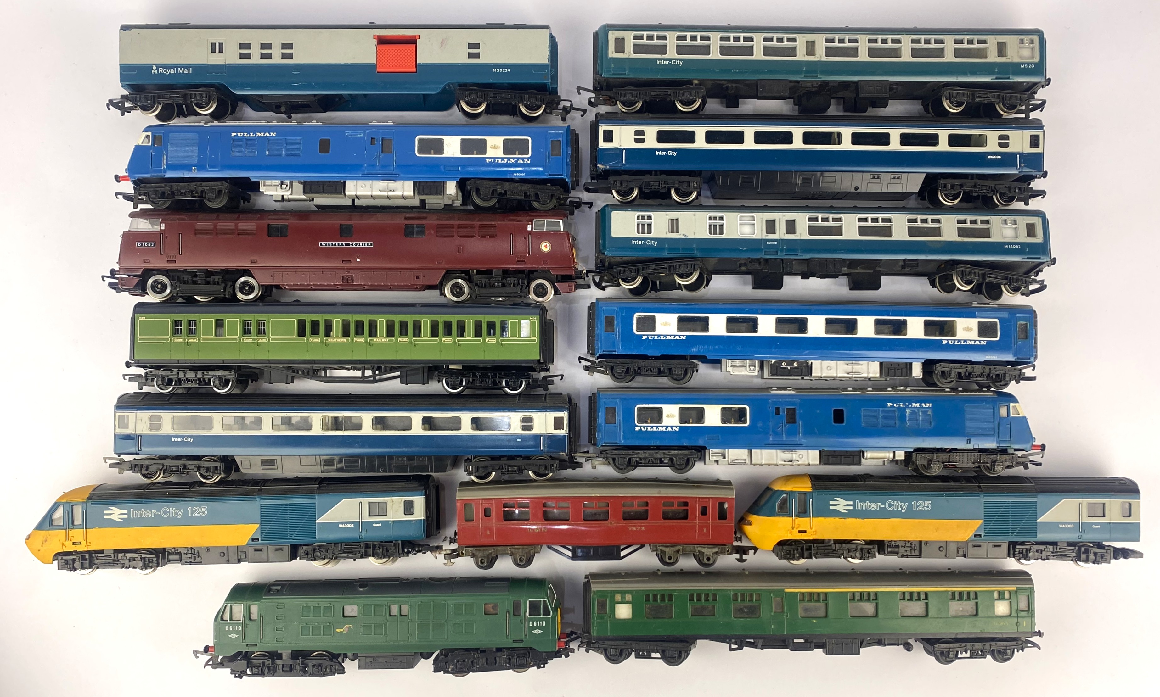 Model Railway: a collection of mostly Hornby and Tri-ang 00 gauge model railway trains and coaches to include Hornby Inter-City 125 and Hornby Diesel Western Courier