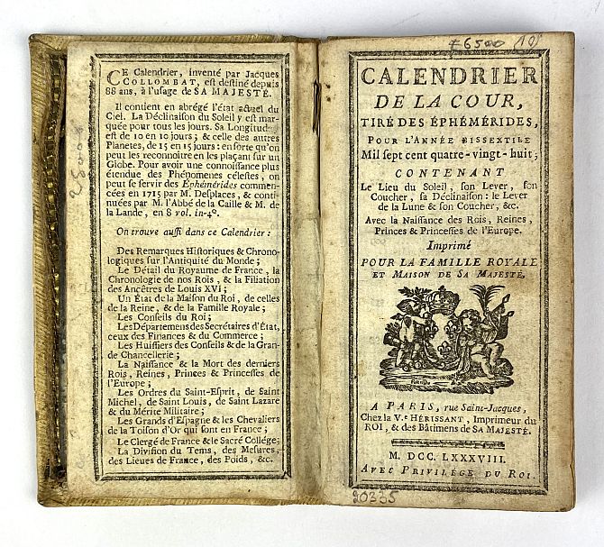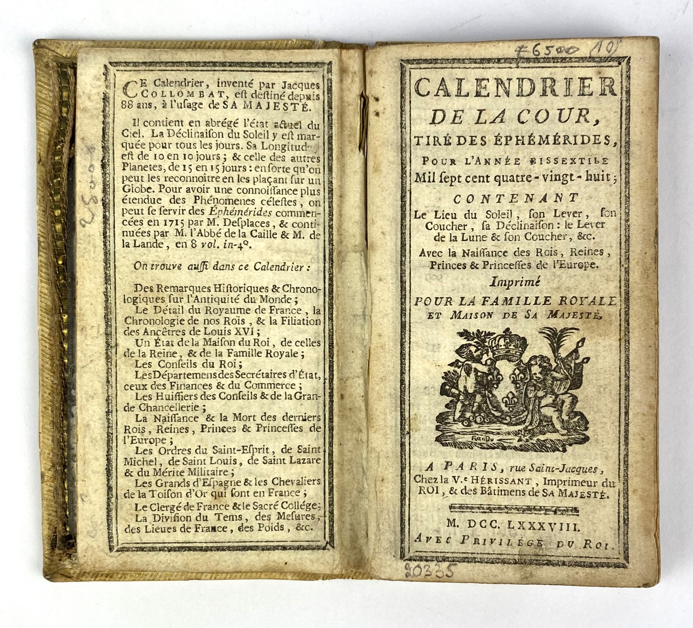 Le Calendrier de la Cour, tiré des Ephémerides Pour l’annee bisstextile Mil fept cent quatre-vingt-huit [.....] Imprimé pour la Famille Royale, et Maison de Sa Majesté. Paris: Jacques Collombat, 1788. Invented by printer and typefounder Jean-Jacques Estienne Collombat (1668–1744), this is one of the longest published Parisian almanacs. The Calendrier de la Cour was published continuously from 1700 to 1792 and offered practical information for members of the royal court