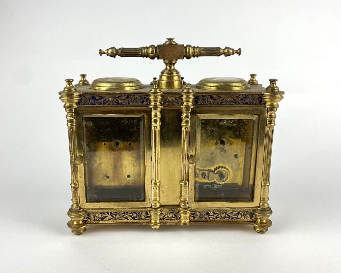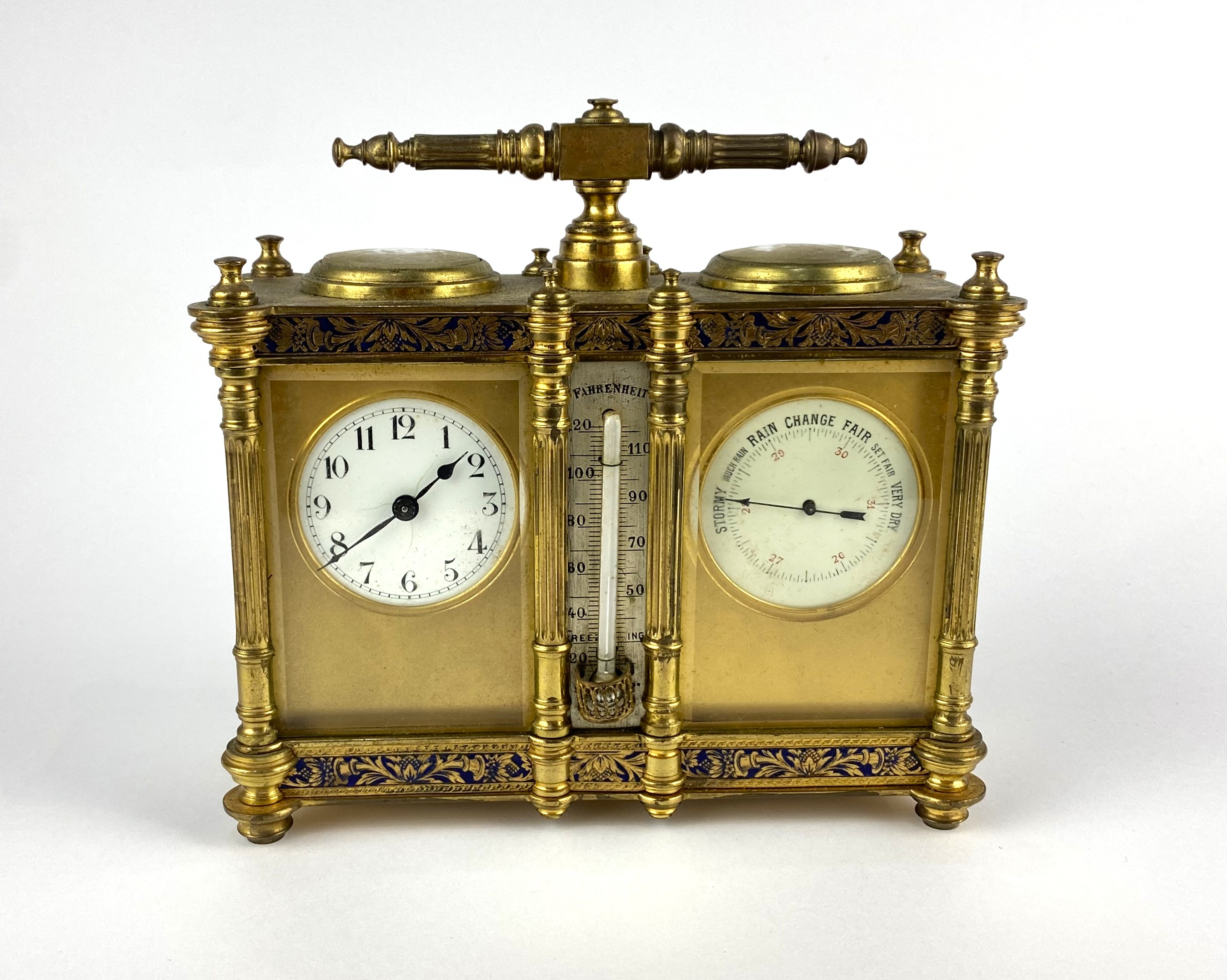 A gilt brass combination carriage timepiece, with clock, barometer and thermometer, 19th century, champleve enamel decorated with floral motif, with reeded carrying handle, top with a pair of viewing apertures, one containing a silvered compass, twin enamelled dials with thermometer set between, within matt gilt surround, rectangular case with reeded columns, clock dial with Arabic numerals and blue steel hands, raised on four round feet, width 16.5cm, height 16.5cm