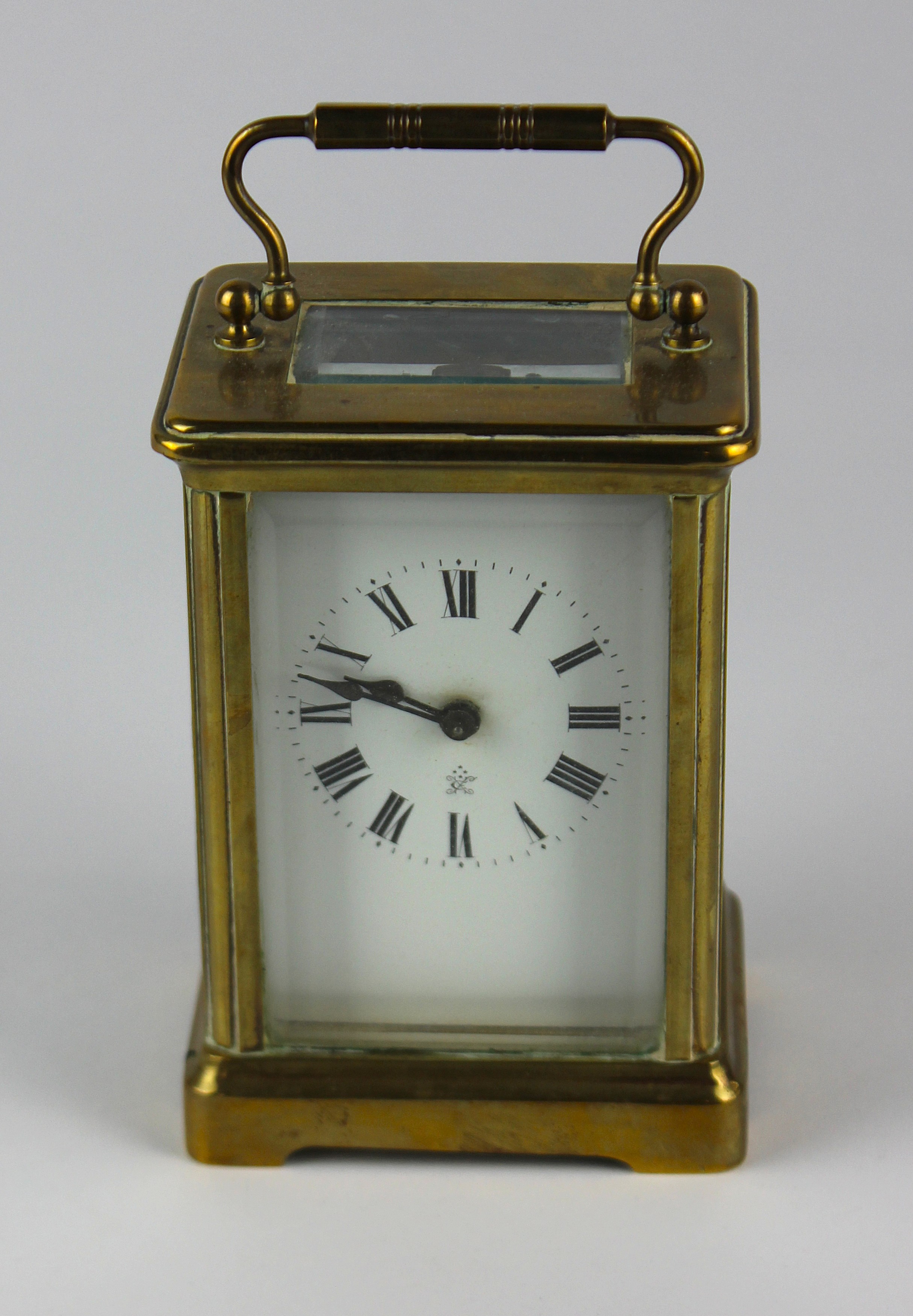 A large French brass carriage clock the white enamelled dial inscribed 'L'Epee S...