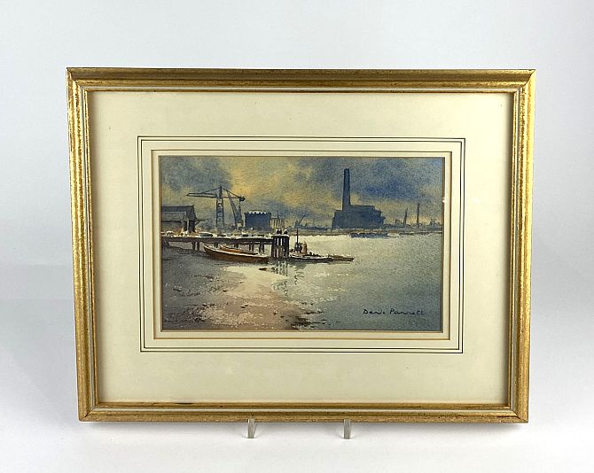 Denis Pannett (British, b.1939), 'The Thames, Bugsby's Reach', watercolour, signed, label verso for The Arun Art Centre, Arundel, West Sussex, 16cm by 25cm, framed.