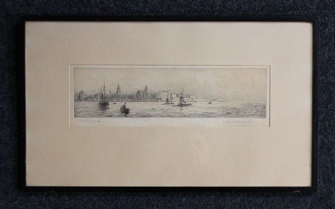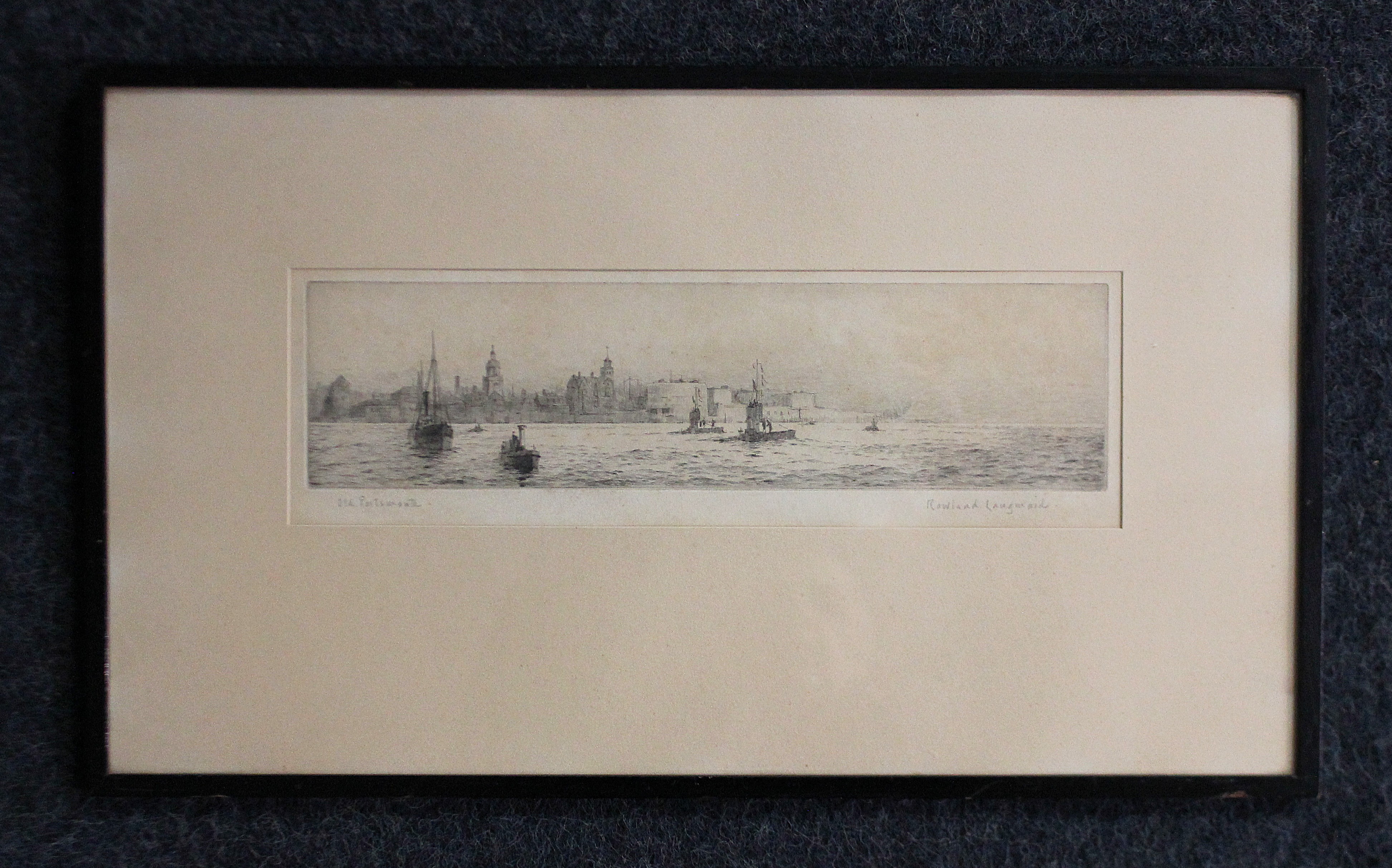 Rowland Langmaid (1897-1956), Old Portsmouth, etching, signed and inscribed in pencil, 10cm by 33.5cm
