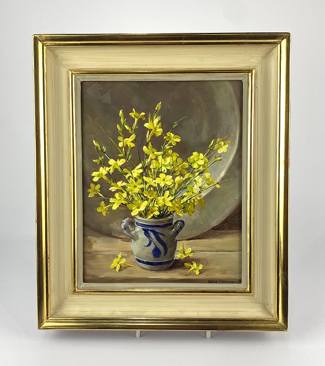 Anne Cotterill (1933-2010), Winter Jasmine, oil on board, signed, verso paper label for Thompson's Aldeburgh, 25.5cm by 20.5cm, with invoice from Thompson's dated 20 March 2002 (ARR)