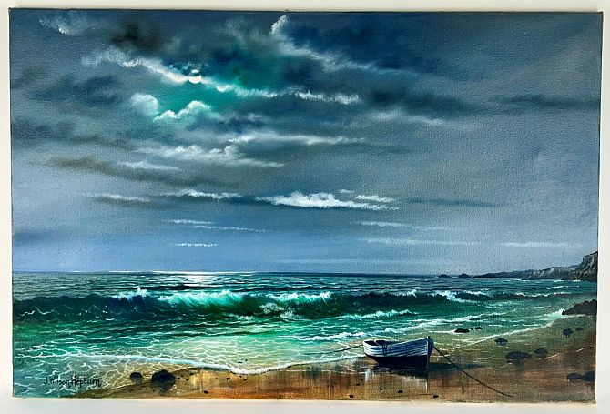 J Wilson Hepburn (20th century), Cornish coastal beach scene beneath a full moon, oil on canvas, signed, 51cm by 76cm, unframed