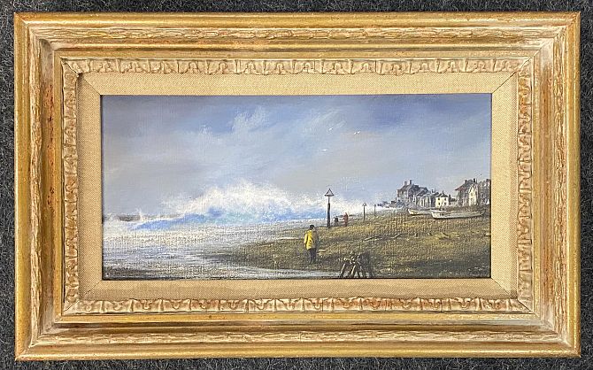 Clive Madgwick (1939 - 2005), 'Beach scene with cottages, moored boats and figures', oil on canvas, signed, 14cm by 29cm, framed.