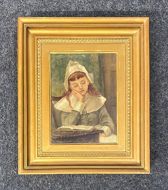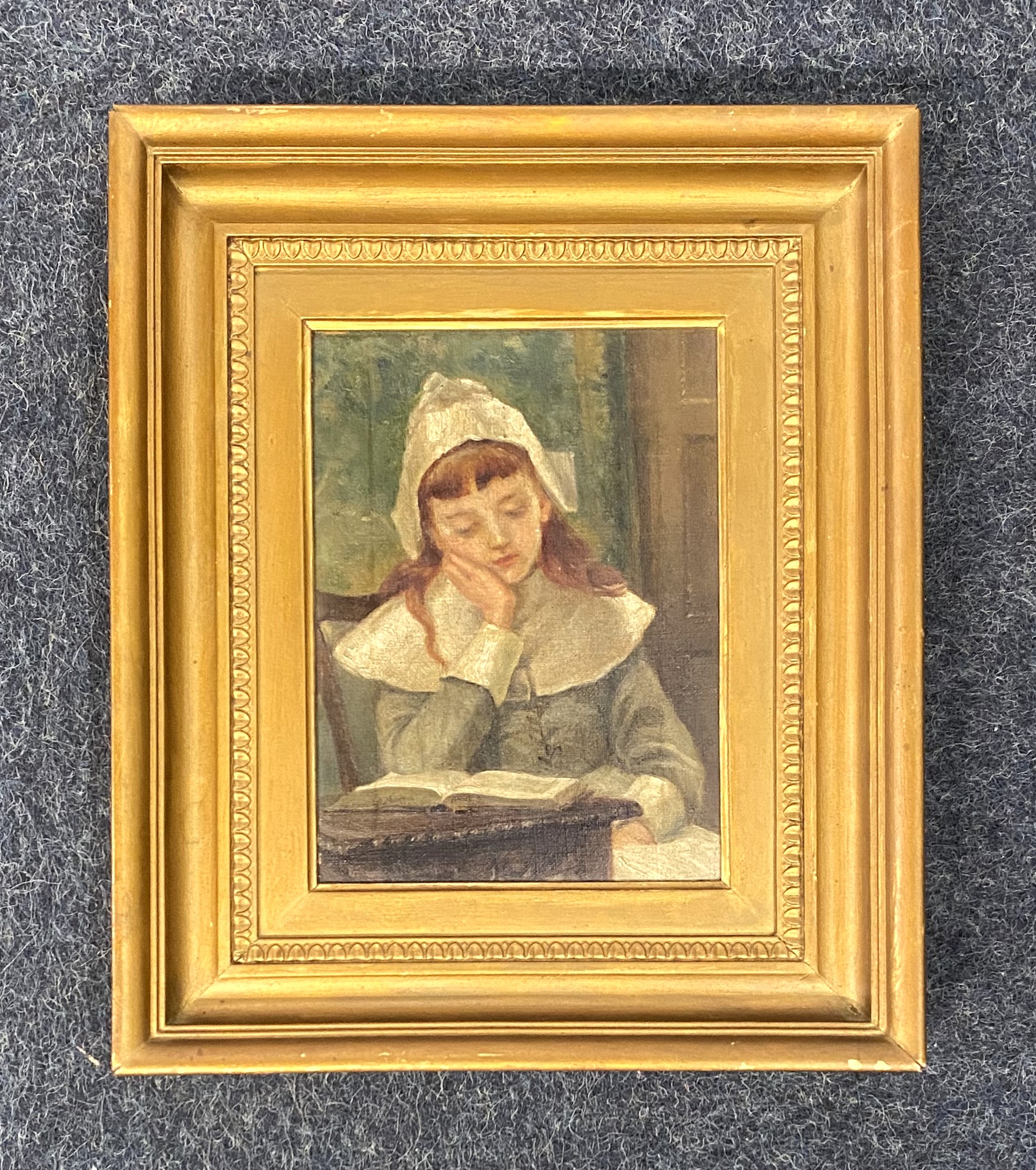 Blanche F. MacArthur (1847 - 1903), 'Phyllis', oil on canvas, signed, bears period hand written label verso 'No 2 Phyllis by Blanche Macarthur, 10 Girdlers Road, Brook Green, Kensington', further inscribed verso, 20cm by 14cm, framed.