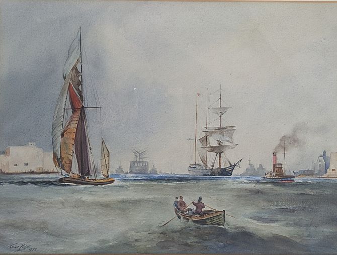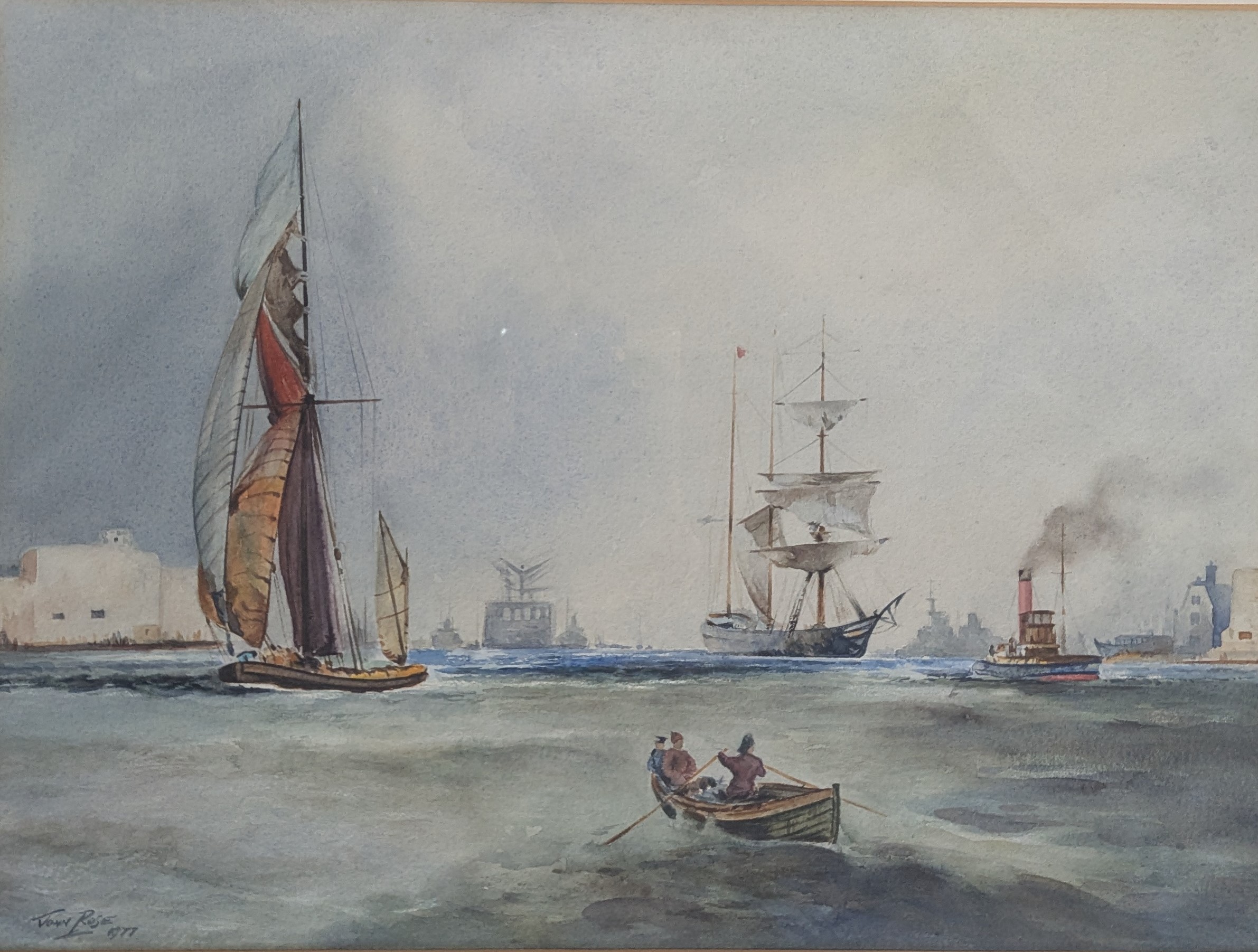 John Rose (20th century), "Entrance to Portsmouth Harbour about 1913", watercolour, signed and dated 1977, inscribed paper label verso, 31.5cm by 43cm