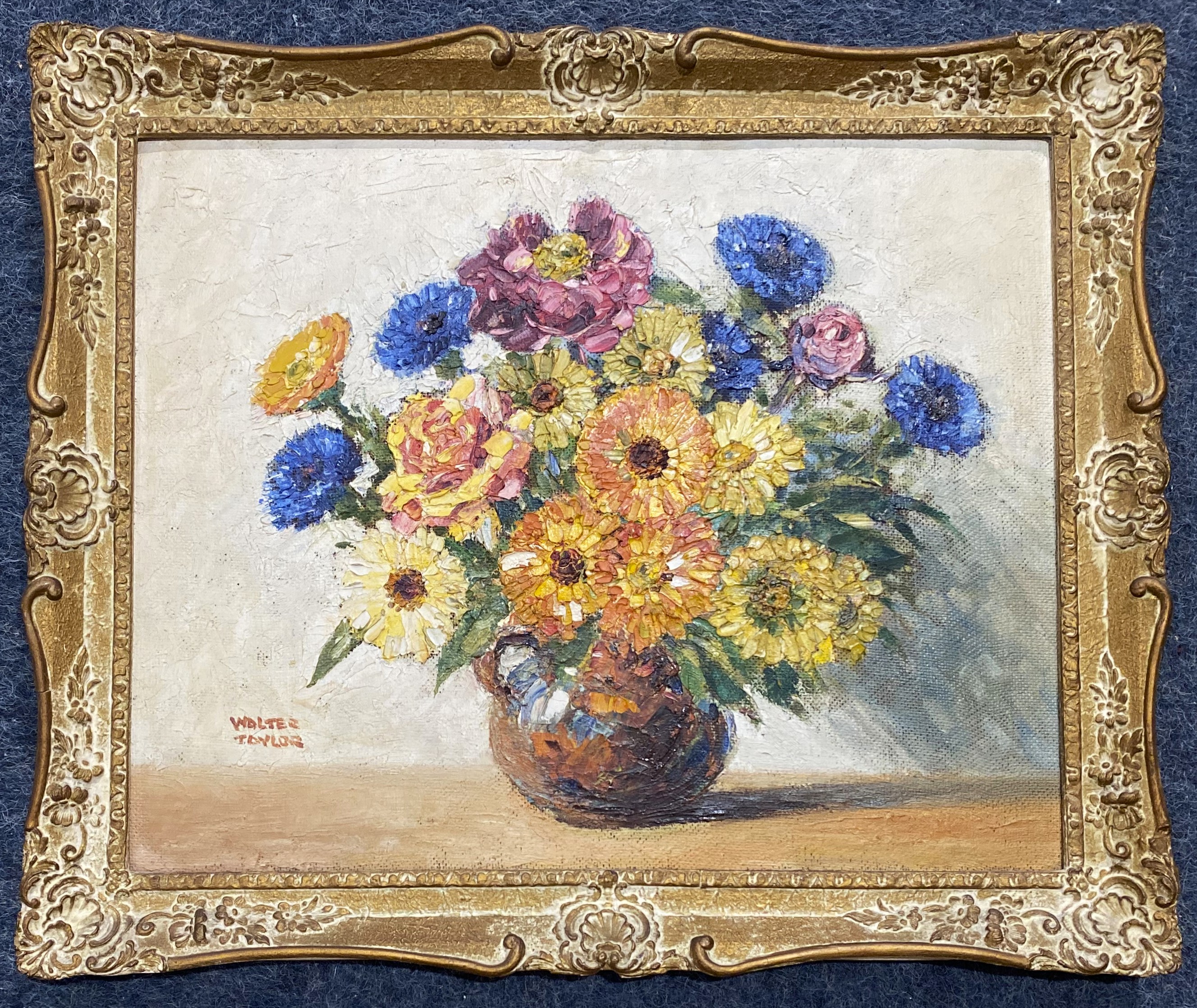 Walter Taylor (Camden Town School 1860-1943), still life of flowers in a brown jug, oil on board, signed, 39.5cm by 49.5cm