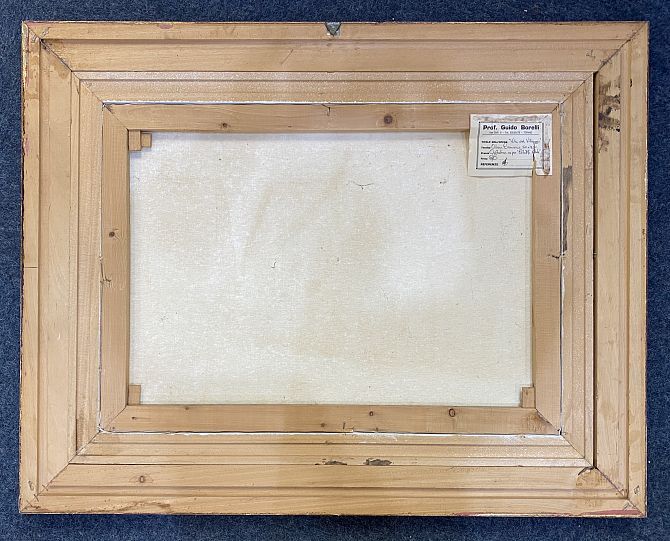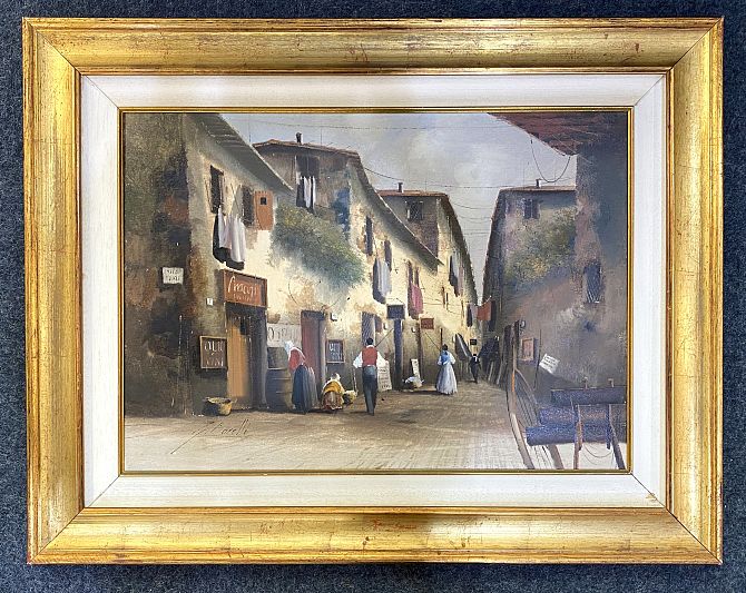 Guido Borelli (Italian b.1952), street scene, 'Vita del Villaggio', oil on canvas, signed, verso inscribed paper label, 51cm by 71cm