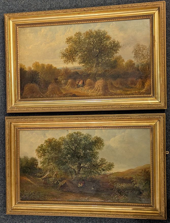 Henry Harris (1852-1926), a pair of bucolic scenes depicting a family amongst haystacks, and camping beneath trees, oil on canvas, signed, 34cm by 62cm