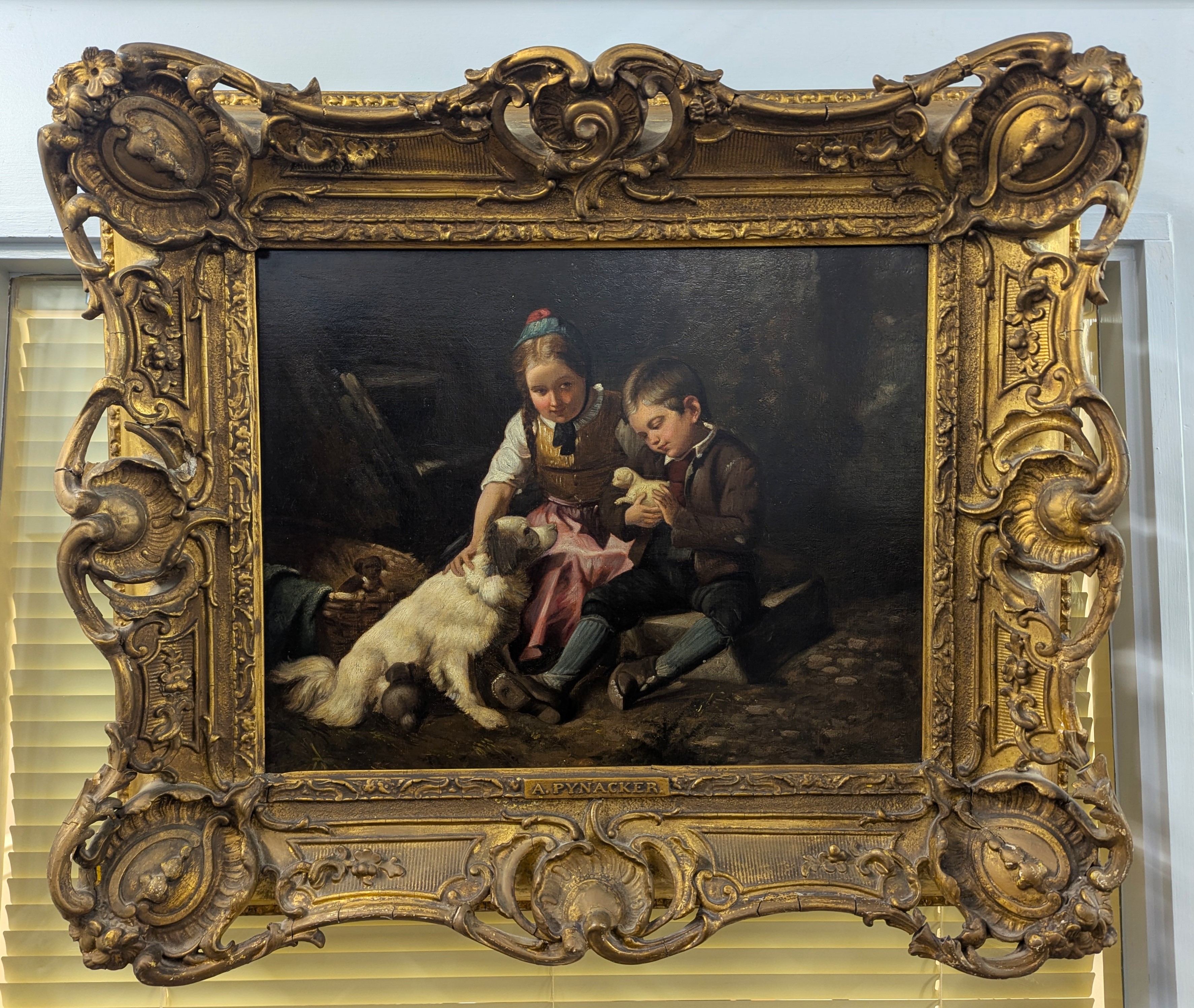 Follower of Adam Pynacker (Dutch 1622-1673), Children with dog, oil on canvas, unsigned, paper label verso for Stacy-Marks, 37cm by 49cm