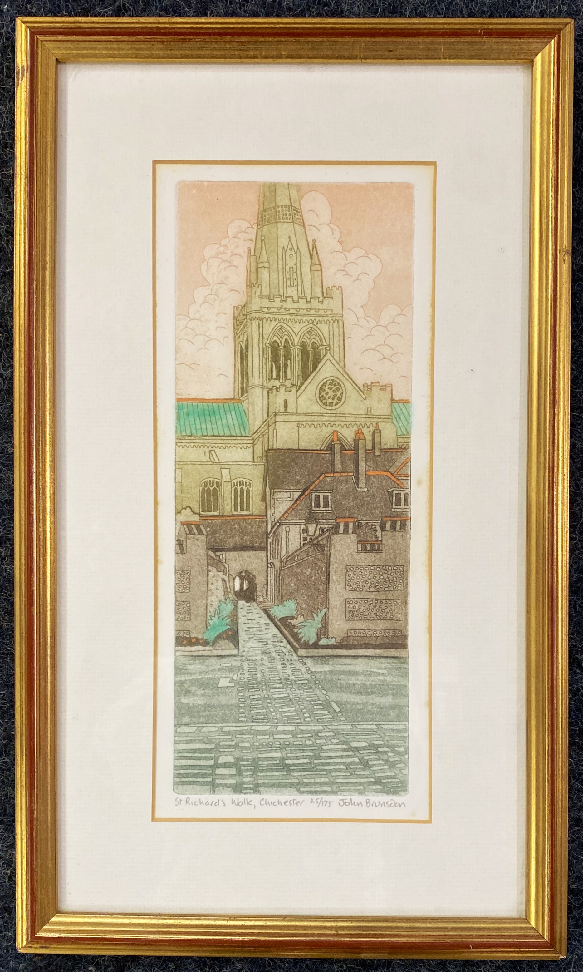 John Brunsdon (1913-2014), St Richard's Walk, Chichester, limited edition coloured etching, numbered 25/175, inscribed and signed in pencil, 31cm by 13cm (ARR)