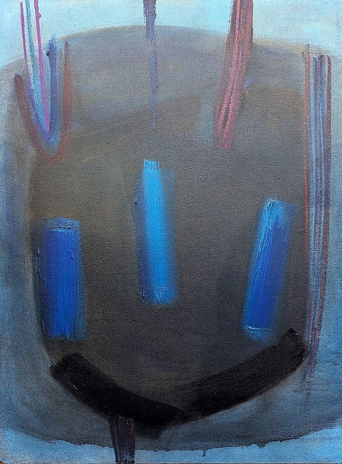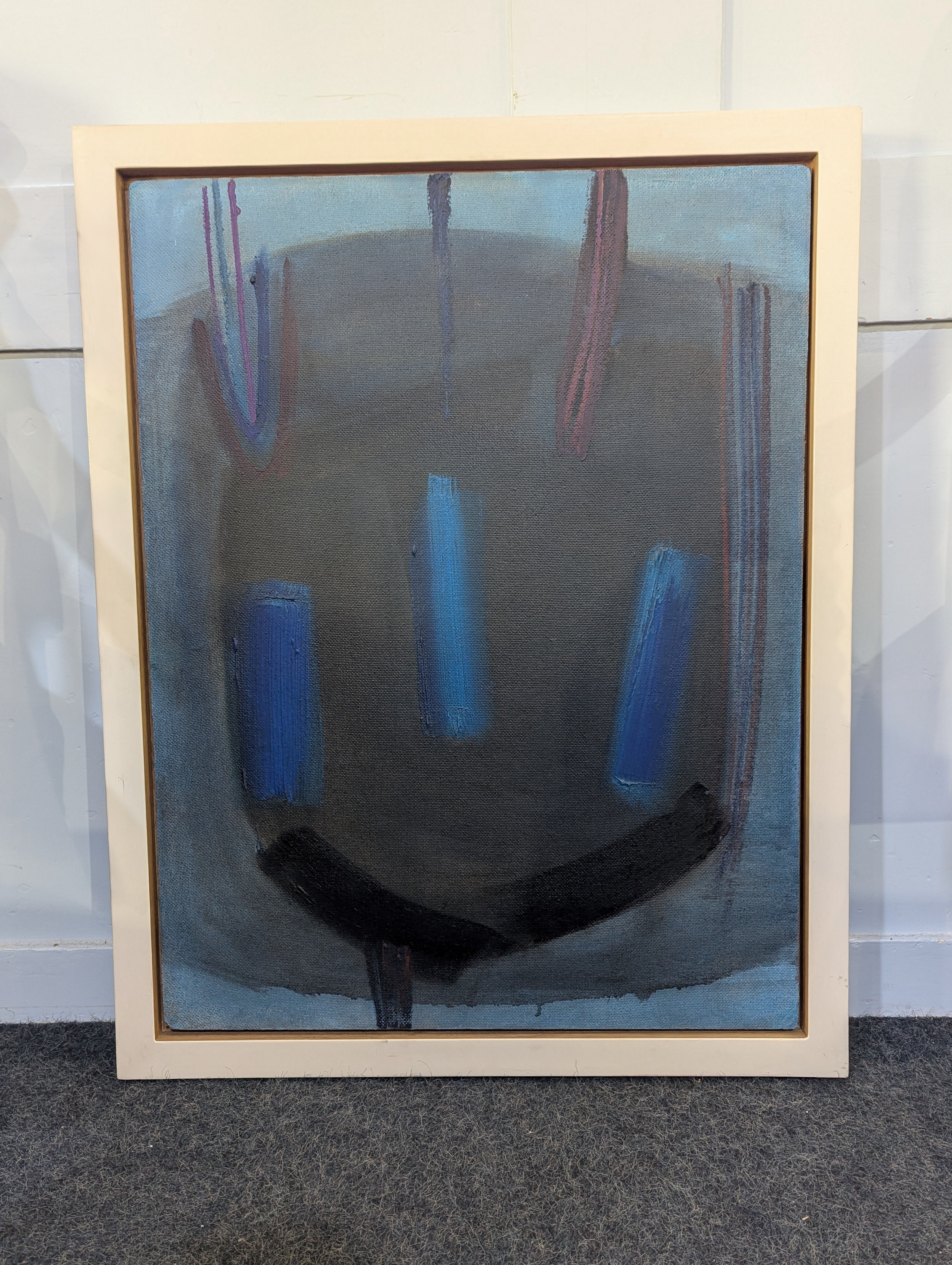 Sir Terry Frost R.A. (British, 1915 - 2003), 'Blue Figure', 1957, oil on board, signed and dated on a label verso, titled and dated by hand verso, and with hand written letter verso by Frost relating to this painting, 76cm by 58cm, framed.