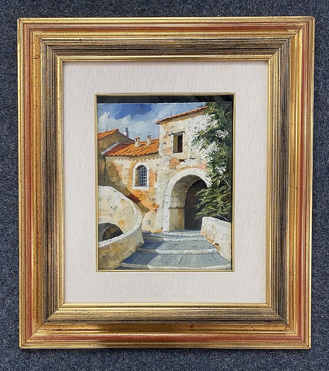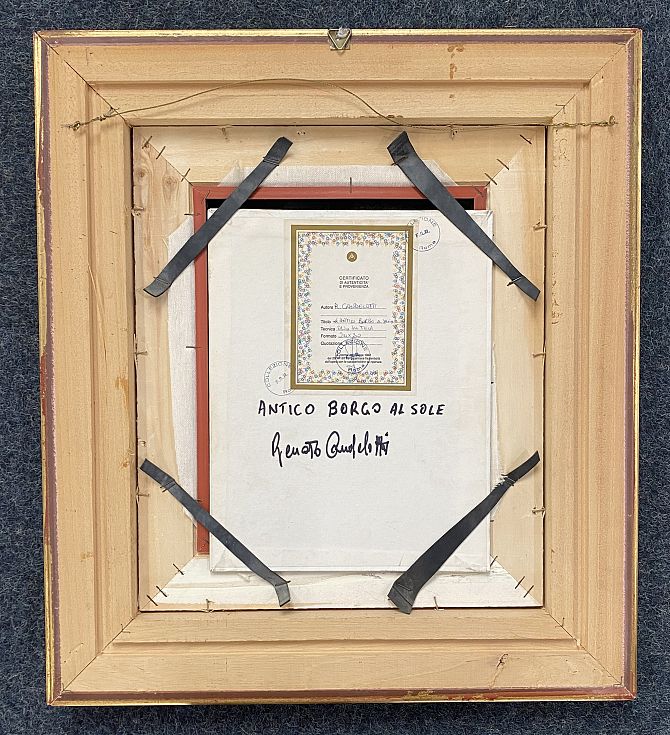 Renato Candelotti (20th century Italian school), 'Antico borgo al sole' [Ancient village in the sun], oil on board, signed, verso inscription and paper label, 28cm by 22cm