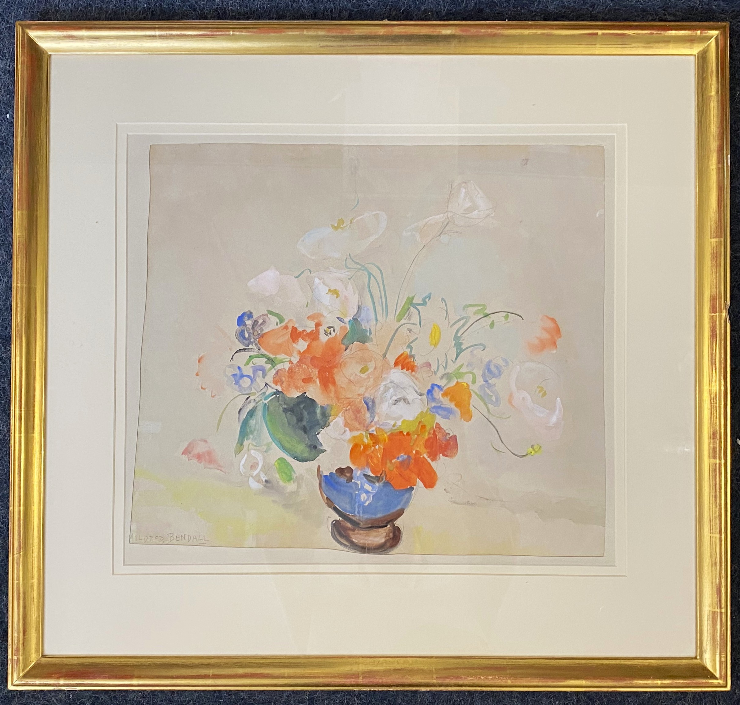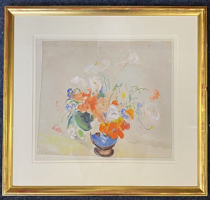 Mildred Bendall (1891-1977), 'Flowers in a vase', watercolour, signed, label verso for Whitford Fine Art, 6 Duke Street, St James, London, 44cm by 49cm, framed.