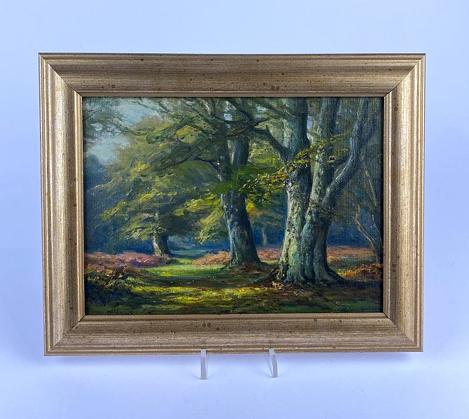 Frederick Golden Short (British, 1863 - 1936), Woodland Landscape (possibly in the New Forest), oil on board, signed and dated 1930, framed, 14.5cm x 20.25cm