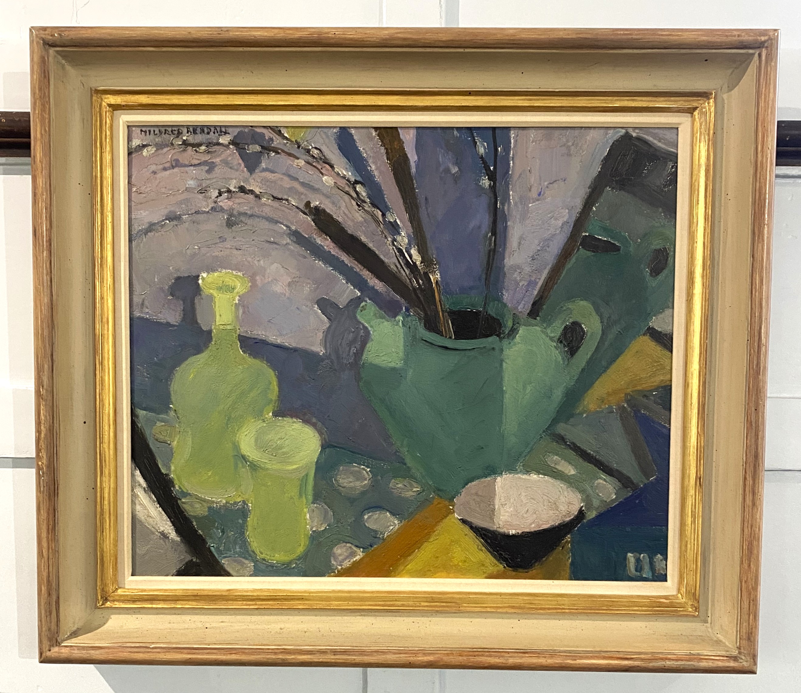 Mildred Bendall (1891-1977), 'Still life with pitcher and carafe', oil on canvas, signed, label verso for Whitford & Hughes, 6 Duke Street, St James, London, 44cm by 53cm, framed.