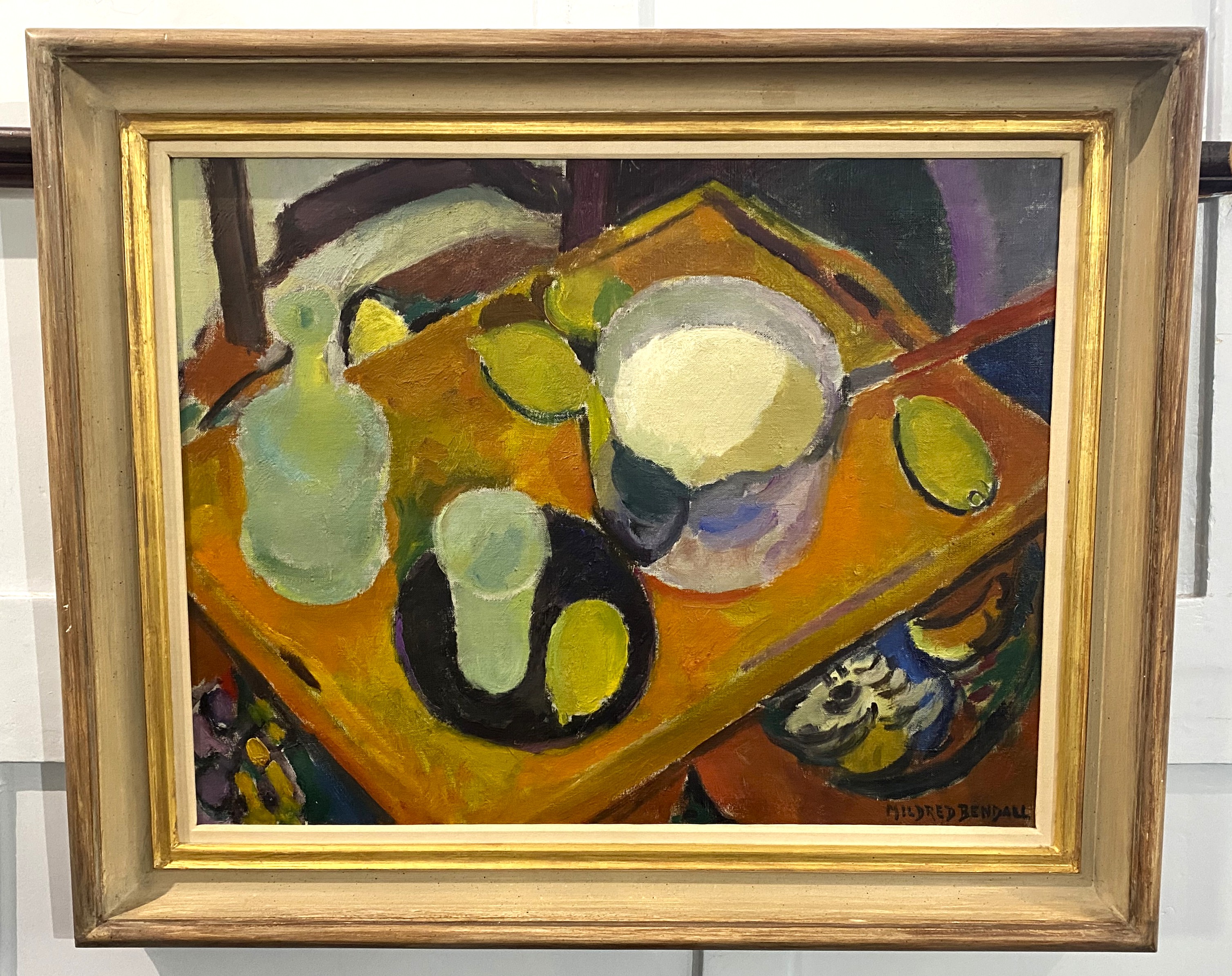 Mildred Bendall (1891-1977), 'A milk pan and lemons', oil on canvas, signed, label verso for Whitford & Hughes, 6 Duke Streeet, St James, London, 48cm by 62cm, framed.