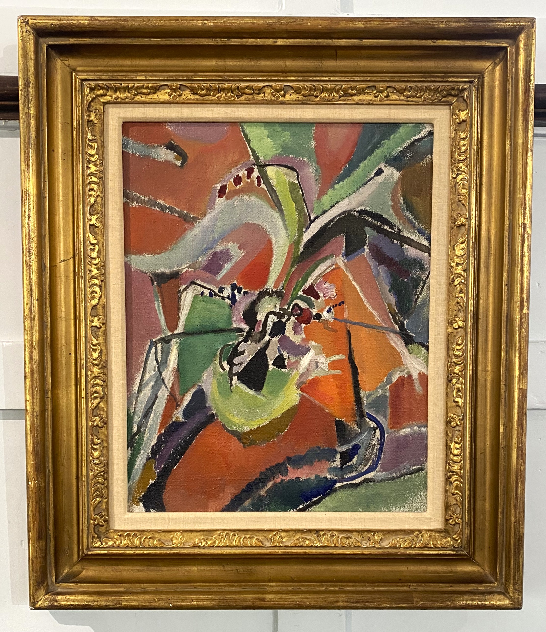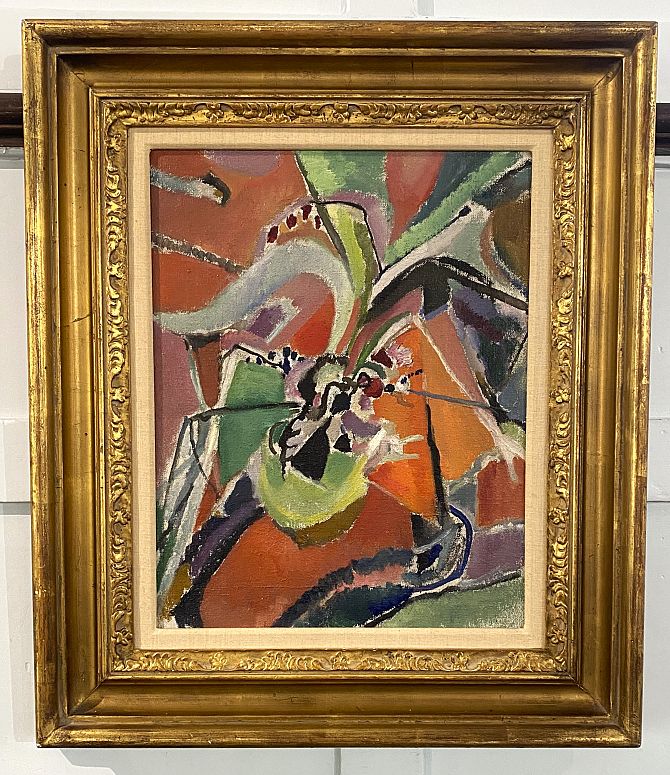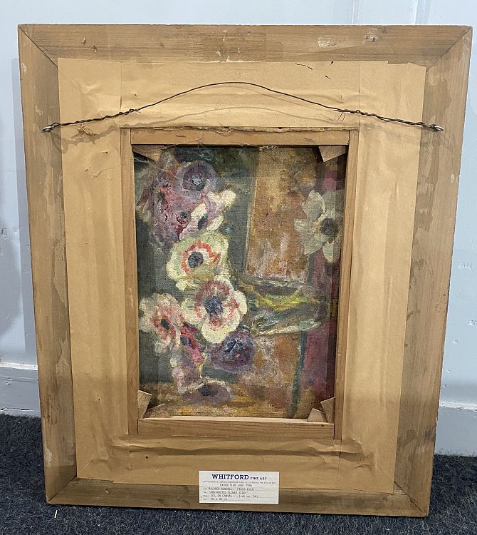 Mildred Bendall (1891-1977), 'Abstracted flower study', oil on canvas, label verso for Whitford Fine Art, 6 Duke Street, St James, London, 40cm by 32cm, framed.
