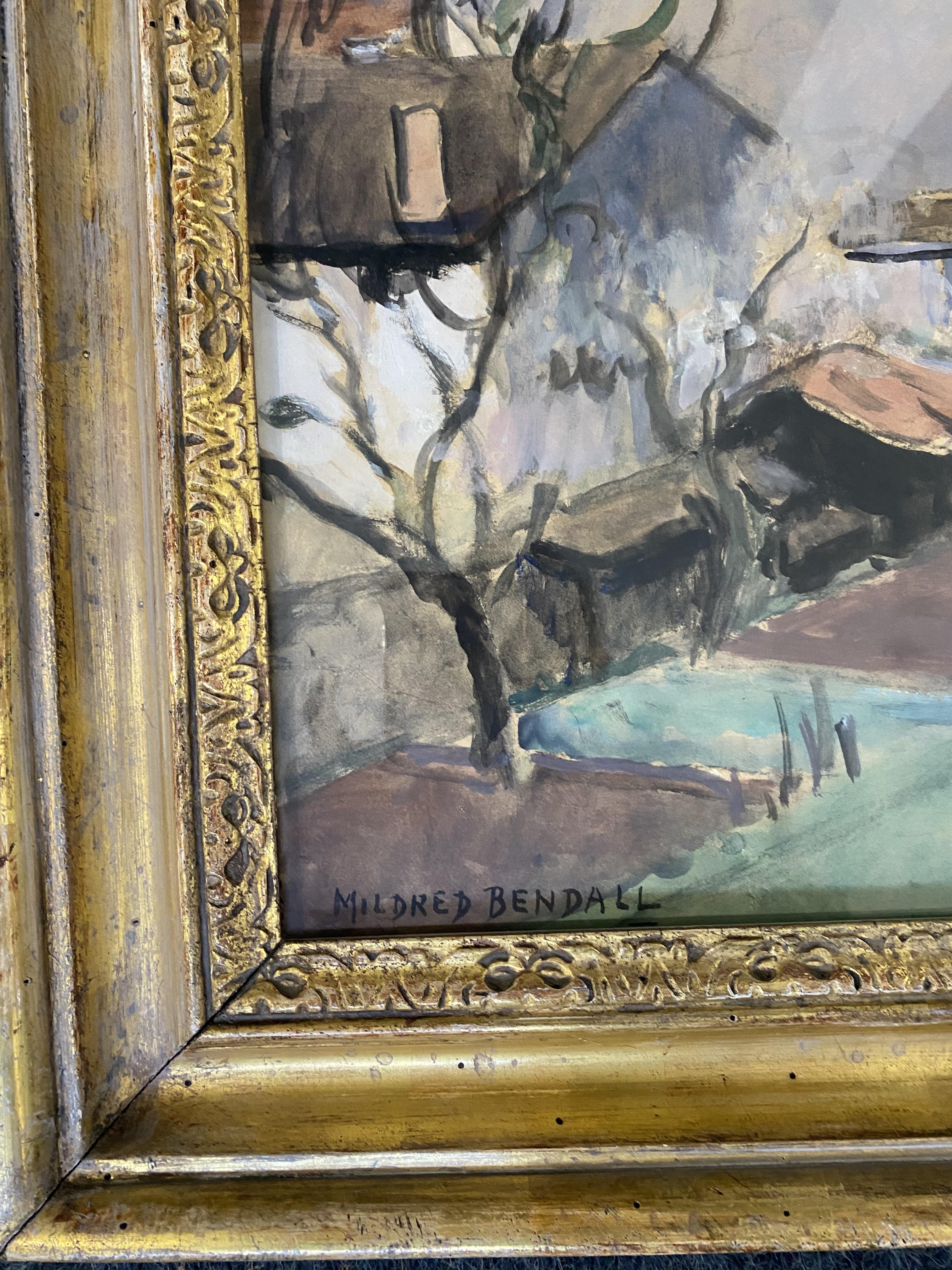 Mildred Bendall (1891-1977), 'Farmhouse Garden', gouache, signed, label verso for Whitford Fine Art, 6 Duke Street, St James, London, and another older label verso, 40cm by 60cm, framed.