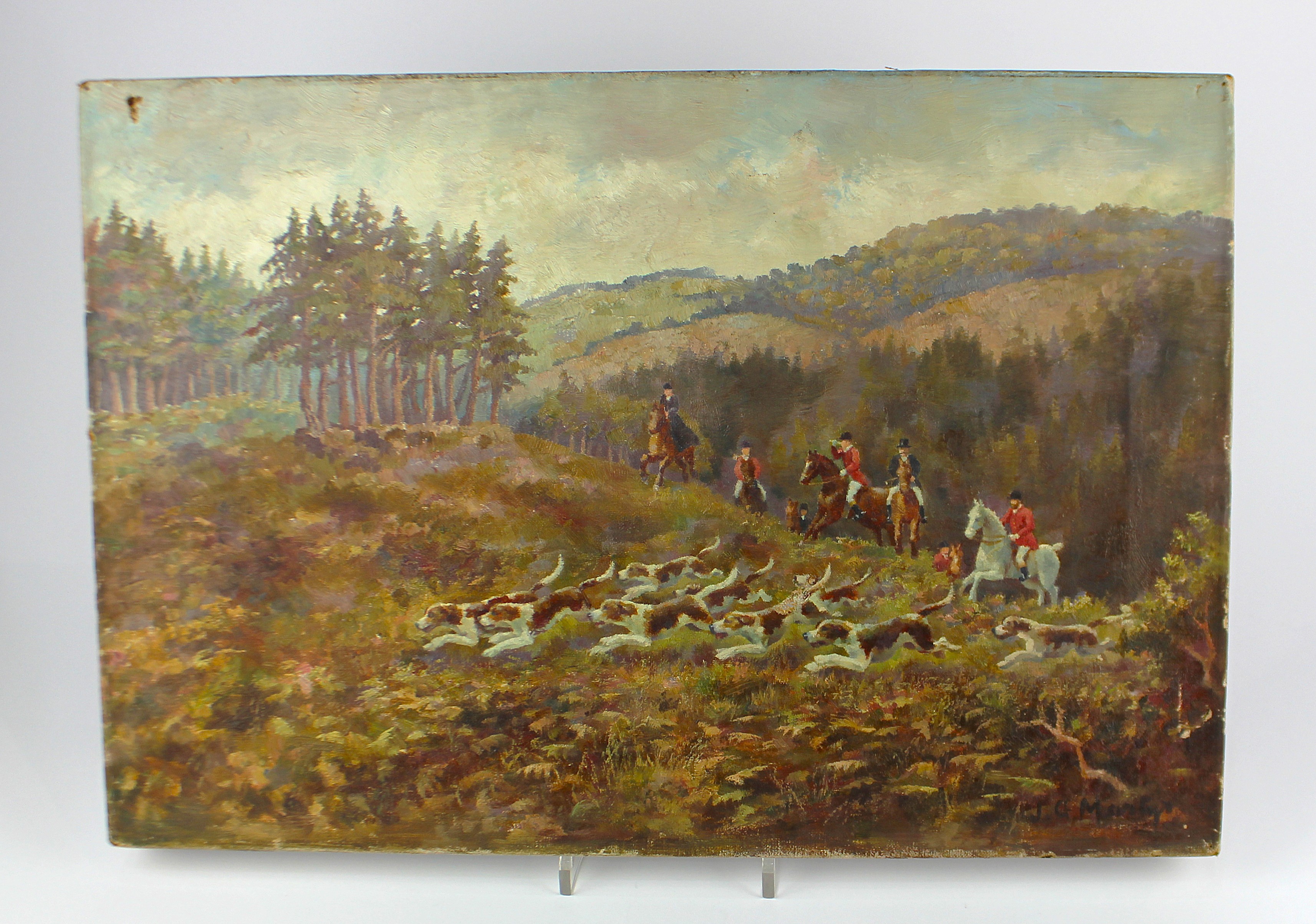 British School (20th century) fox hunting scene, within a mountainous landscape, oil on canvas, indistinctly signed lower right 'J. G. M******', 33cm x 48cm (AF)