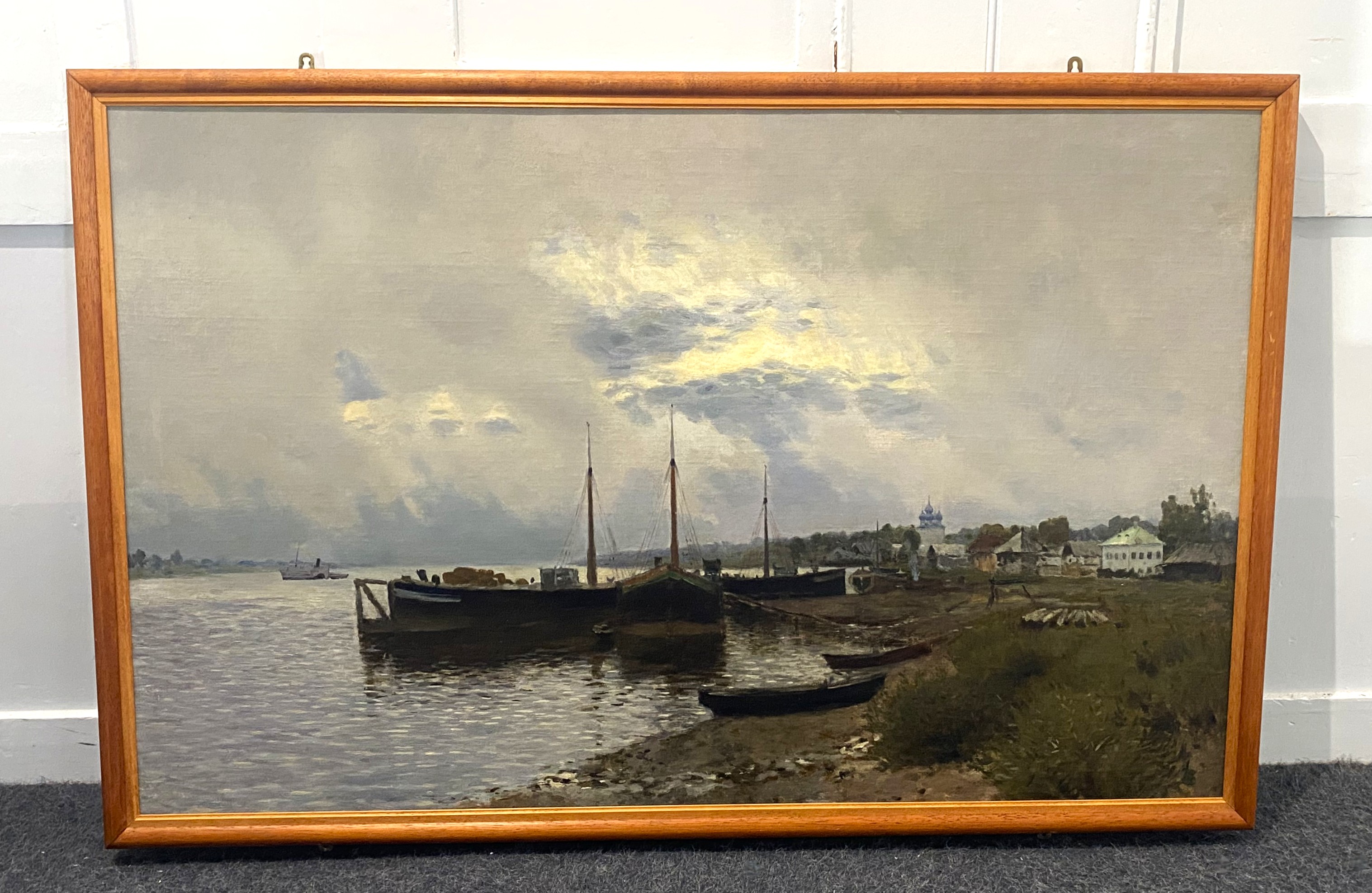 After Isaak Levitan (Russian, 1860 - 1900), 'After the Rain, Plyos', oil on canvas, inscribed by hand verso, 77cm by 121cm, framed.